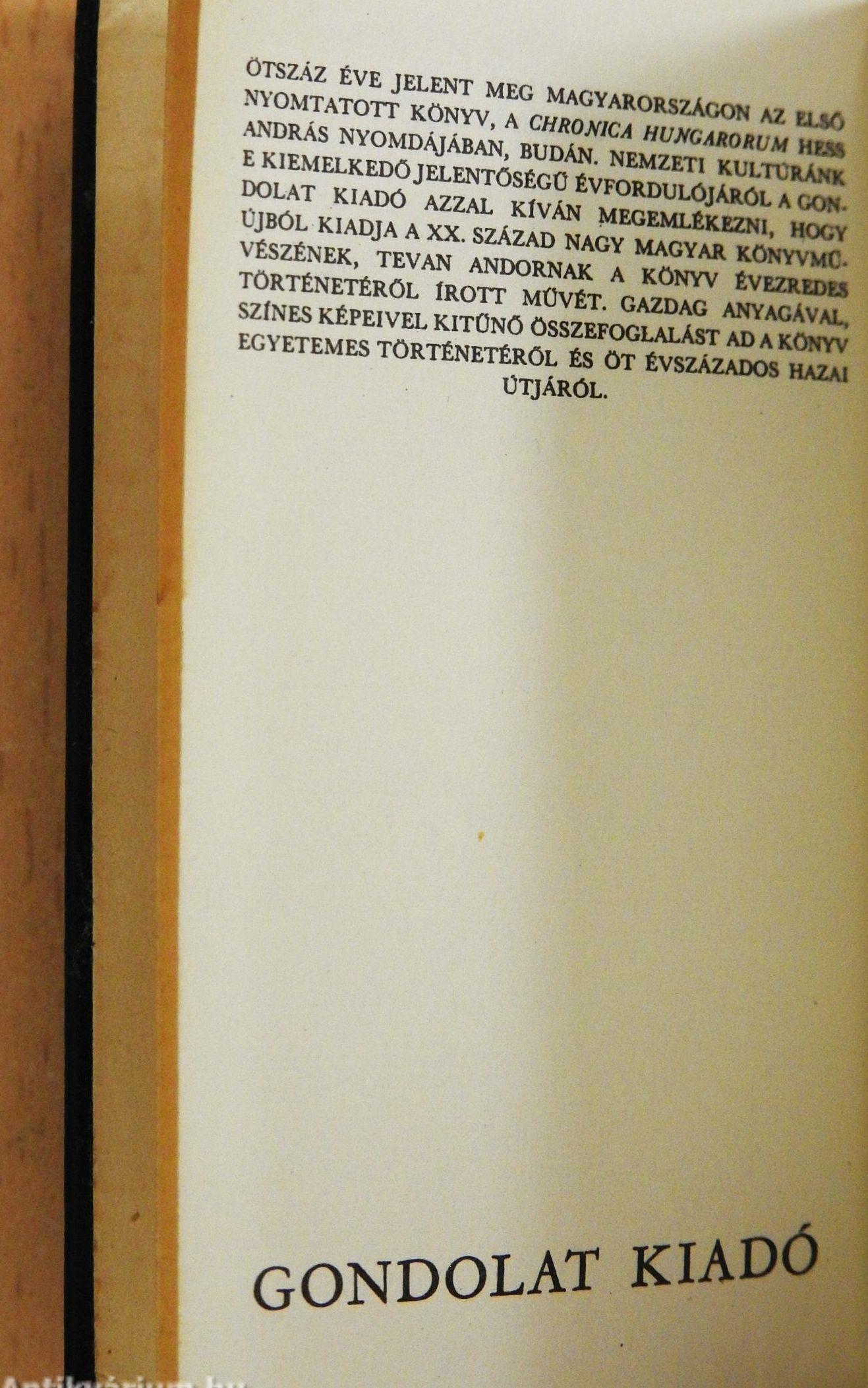 | Megjegyzés: | Számozatlan kiadás. Kiadott példányszám: 2200 Könyvtervező: Kálmán Emil Nyomda: Zrínyi Nyomda Kiadási alkalom: Ötszáz éve jelent meg Magyarországon az első nyomtatott könyv, a Chronica Hungarorum Hess András nyomdájában, Budán. Fekete-fehér illusztrációkkal. II. javított, rövidített kiadás. A könyv pontos mérete: 41 x 71 mm. |