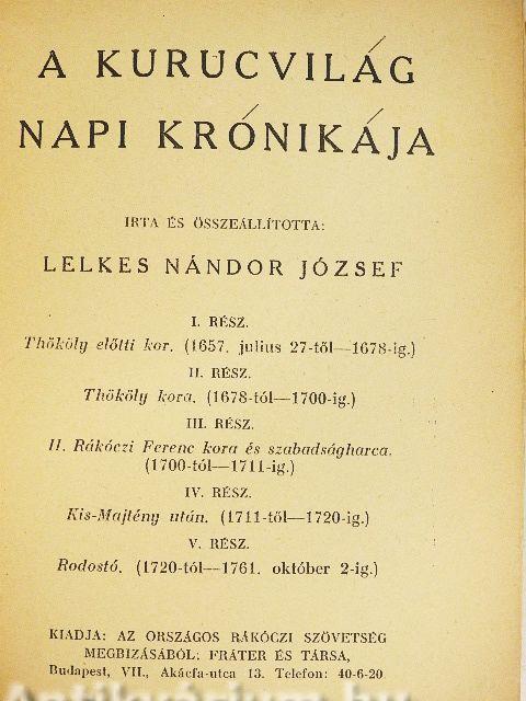 Sok helyről hangzott el már az az óhaj, hogy az eseményekben dús legendás világnak, a kuruckornak egész lefolyását sorrend szerint kellene összeállítani, helyesebben egy önálló munkába foglalni. Bár a számadatok e rég letűnt idők eseményeinek tömegében sokszor eltérőek, ami az összeállítást megnehezíti, ennek dacára e könyv azzal a célzattal készült, hogy szolgálatot tegyen az érdeklődőnek, aki az események idejét keresi és dióhéjban megismertesse a kurucvilágot azzal is, aki nem csak az időpontokat, de azok tárgyait sem tudja, egyben az egész anyagot népies irányban ismerteti, hogy az mindenki számára használható legyen. Hogy ez mennyiben sikerült, azt döntse el az olvasó. I-ső Lipót uralkodásától, illetve a Wesselényi-féle összeesküvéstől, mint a keletkezett kurucvilág kiinduló pontjától kezdődőleg öt fejezetben a történtek sorrendjében Mikesnek Rodostóban bekövetkezett haláláig ismerteti e könyv e letűnt kort. Könnyebb áttekintés végett a fel-felmerülő kisebb-nagyobb események röviden vannak feltüntetve a pontokban, sőt ahol kellett ezek előzményei, vagy következményei is, miért is a dűlt betűkkel szedett részek képezik a tulajdonképeni lényeget, melyek az alattuk lévő számokra, illetve időre szorosan vonatkoznak. Továbbá, ahol sikerült megállapítani a közelebbi időt pl. a nap szakát, reggel, délben, este, vagy óráját, azt is feltüntettük.