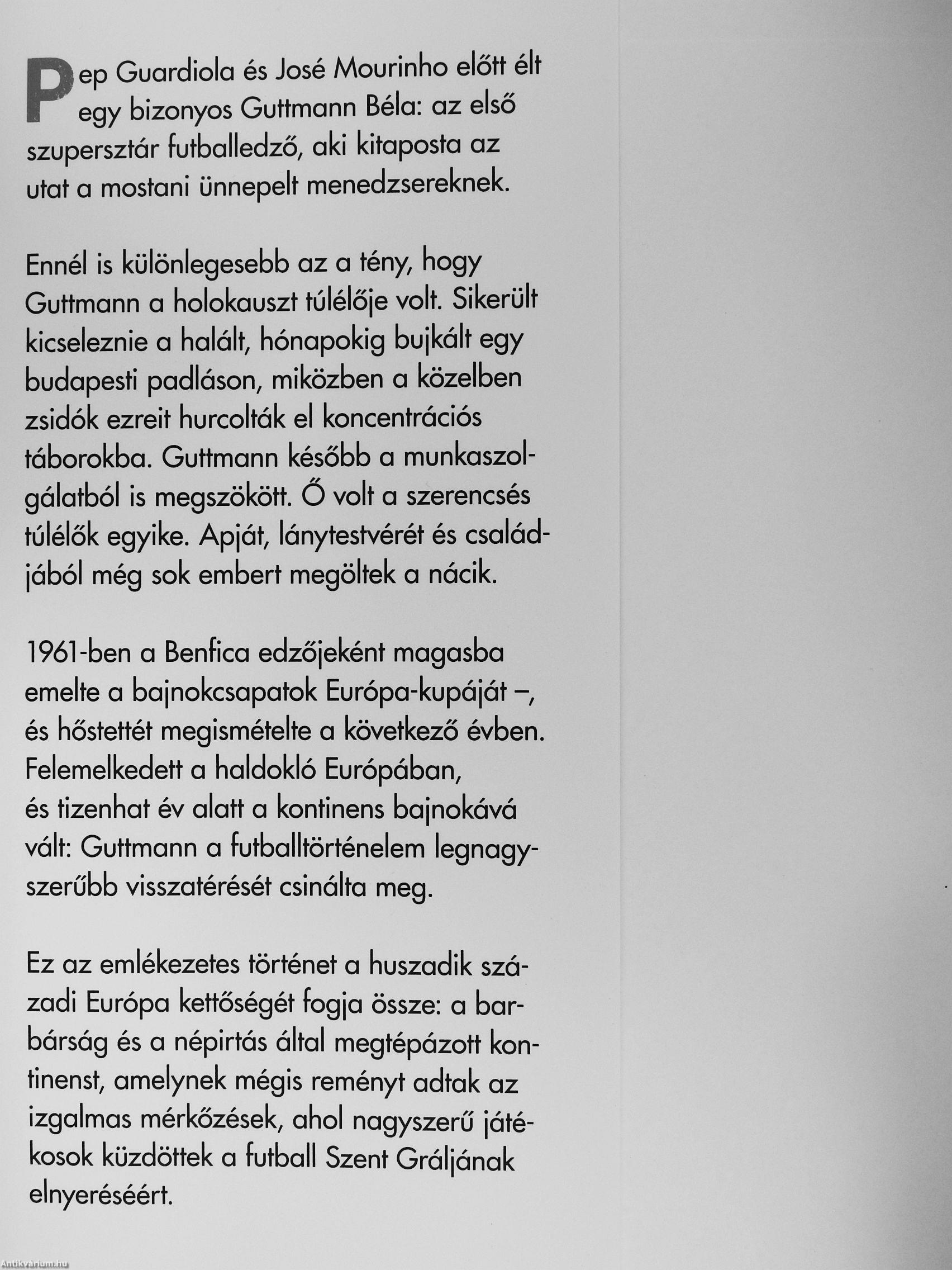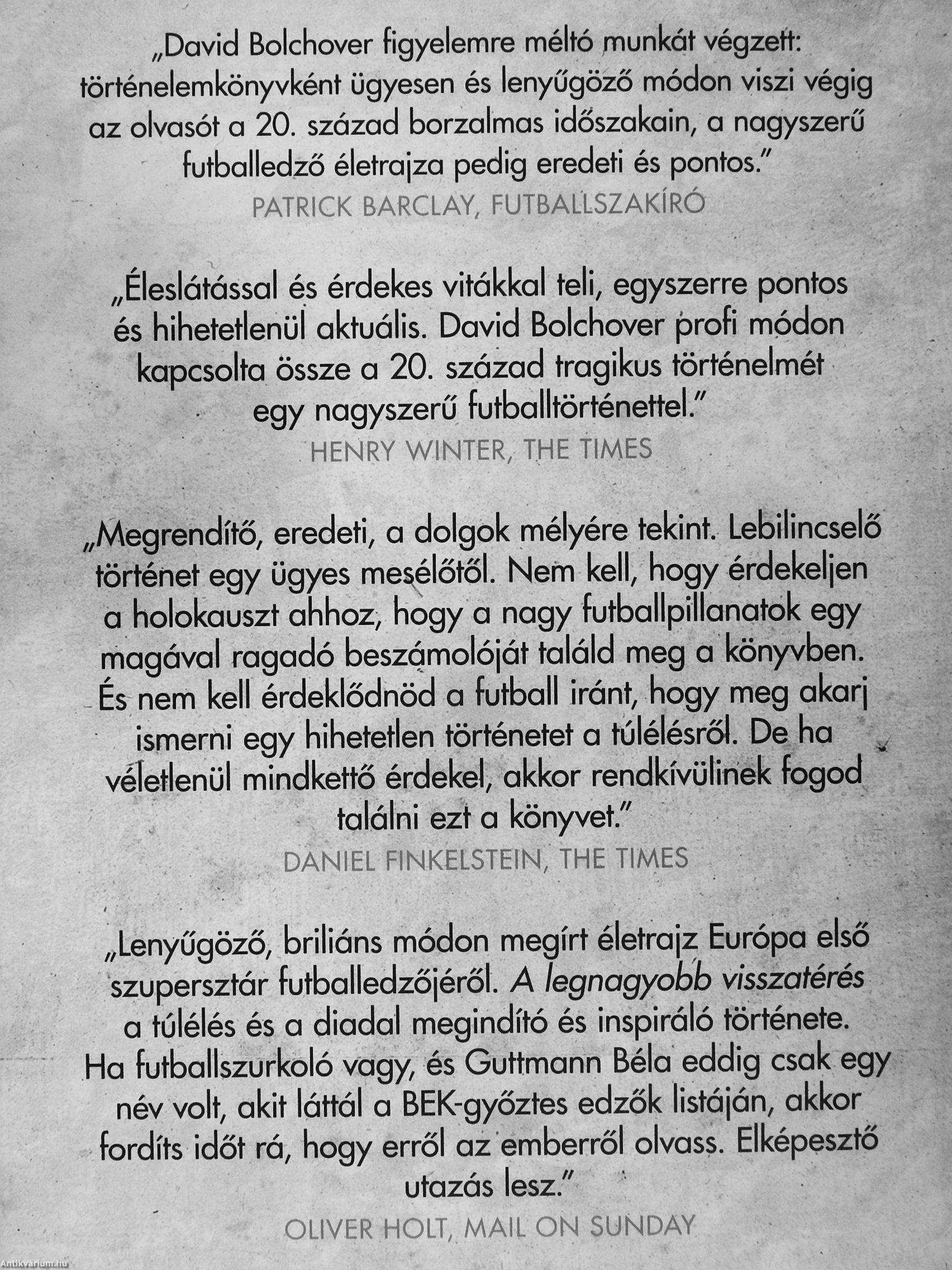 „Lenyűgöző, briliáns módon megírt életrajz Európa első szupersztár futballedzőjéről. A legnagyobb visszatérés a túlélés és a diadal megindító és inspiráló története. Ha futballszurkoló vagy, és Guttmann Béla eddig csak egy