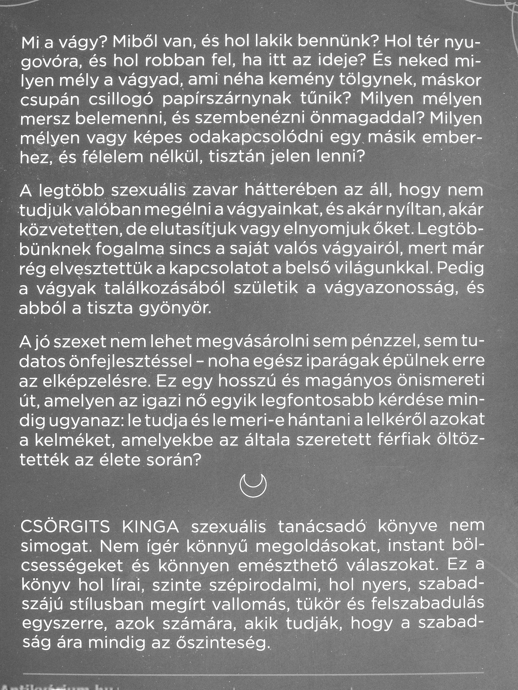 CSÖRGITS KINGA szexuális tanácsadó könyve nem simogat. Nem ígér könnyű megoldásokat, instant bölcsességeket és könnyen emészthető válaszokat. Ez a könyv hol lírai, szinte szépirodalmi, hol nyers, szabadszájú stílusban megírt vallomás, tükör és felszabadulás egyszerre, azok számára, akik tudják, hogy a szabadság ára mindig az őszinteség.