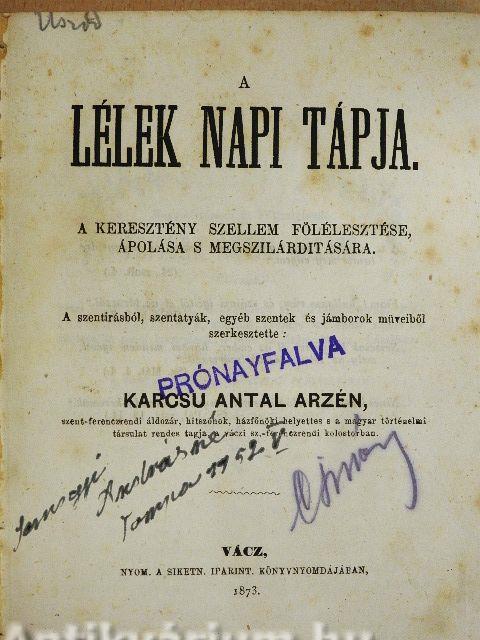 A szeintirásból, szentatyák, egyéb szentek és jámborok müveiből szerkesztette: Karcsu Antal Arzén, szent-ferenczrendi áldozár, hitszónok, hátfőnöki helyettes s a magyar történelmi társulat rendes tagja, a váczi sz.-ferenczrendi kolostorban. Nyomtatta a Siketn. Iparint. Könyvnyomdájában, Vácz.