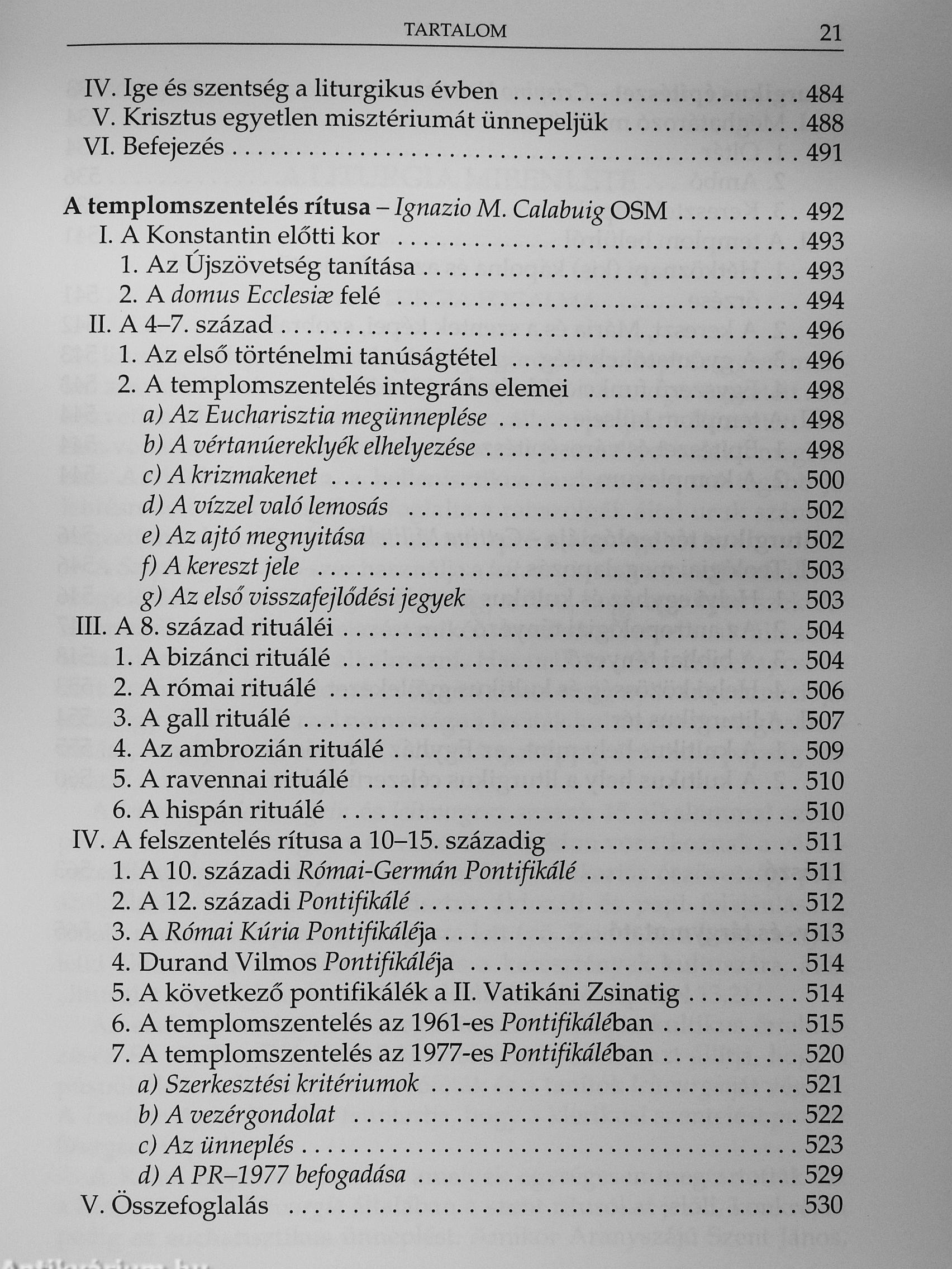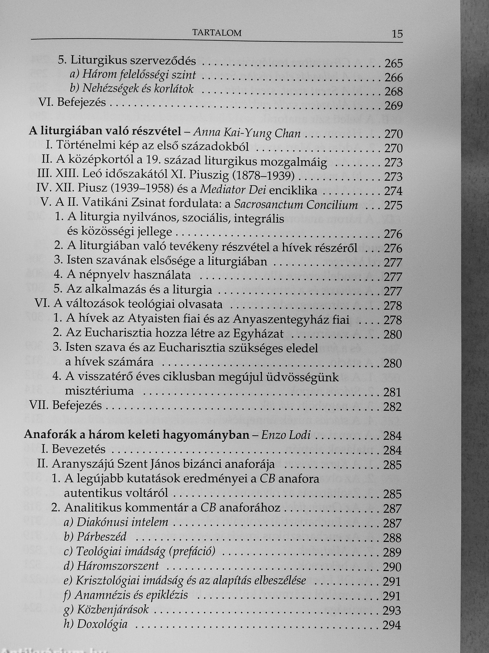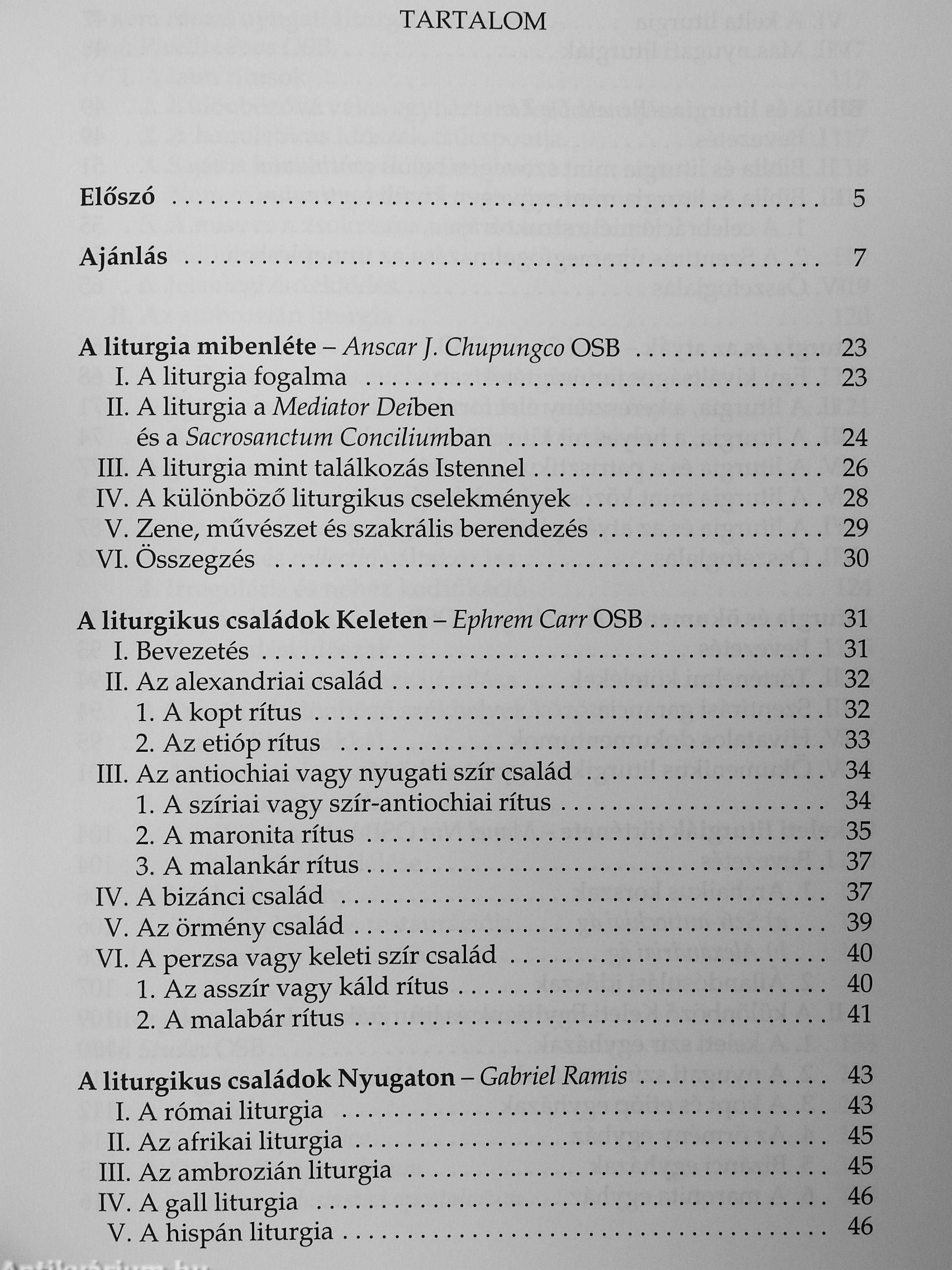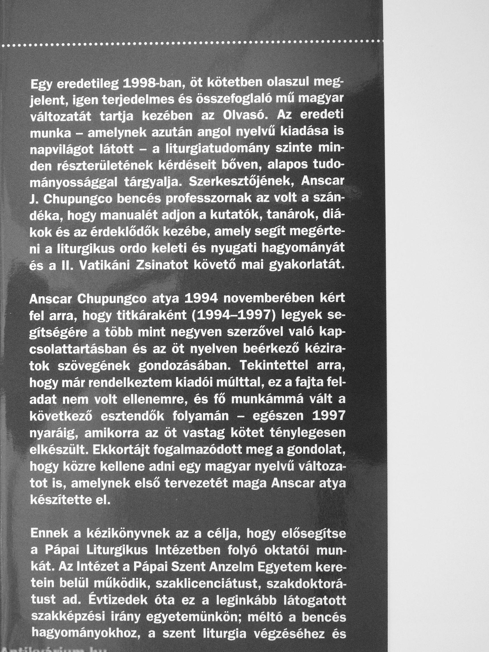 Egy eredetileg 1998-ban, öt kötetben olaszul megjelent, Igen terjedelmes és összefoglaló mű magyar változatát tartja kezében az Olvasó. Az eredeti munka - amelynek azután angol nyelvű kiadása is napvilágot látott - a liturgiatudomány szinte minden részterületének kérdéseit bőven, alapos tudományossággal tárgyalja. Szerkesztőjének, Anscar J. Chupungco bencés professzornak az volt a szándéka, hogy manualét adjon a kutatók, tanárok, diákok és az érdeklődők kezébe, amely segít megérteni a liturgikus ordo keleti és nyugati hagyományát és a 11. Vatikáni Zsinatot követő mai gyakorlatát.