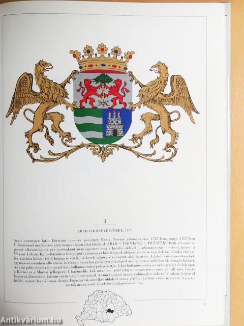 Minden címer egy kis történelmet sűrít magába. Így van ez a vármegyék régi címereivel is. A könyvben a szerző ír a vármegyerendszer kialakulásával foglalkozó elméletekről, a királyi megyék szervezetéről, majd a nemesi vármegyék megszületéséről, s végül az 1870-1886 közötti nagy átalakulásról, a polgári vármegyék új közigazgatási rendszerének törvénybe iktatásáról. A 71 vármegye színes címertáblája mellett összefoglalja az adott megye kialakulását, történetét, helyenként utal a terület életében nagyobb szerepet játszott családokra, illetve címerükre, ha azok beleépültek a megyecímerbe, majd részletesen leírja a címert. E címerleírások tele vannak szakszavakkal, szakkifejezésekkel, ezeket megmagyarázza és más címertani ismereteket is közread a könyv egy egész fejezetben 363 fekete-fehér címerrajz segítségével. Beszél a címerviselés eredetéről (a tetőtől talpig vasba öltözött lovagok felismerését, megkülönböztetését célozta), elterjedéséről (nem csoda, hogy a tetszetős, előkelőséget sugalló jelvények használatát átvették a katonáskodó nemesektől egyházi személyek, polgárok, parasztok is), a címernyerésről (sokan emberemlékezet óta viseltek címert, s azt később az uralkodó jóváhagyta, másokat királyi kegy jutalmazott címerrel hőstettükért, de volt, aki maga találta ki magának címerét, s azt önkényesen, királyi adományozás, jóváhagyás nélkül használta). A címer legfontosabb részének, a pajzsnak, formájának, a rá került ábrázolásoknak igen részletes ismertetése mellett szó esik a kiegészítő elemekről: a sisakról és díszítményeiről, valamint a címer eredeti hordozójával, a fegyverzettel (pajzs, sisak) össze nem függő egyéb járulékos kiegészítőkről, mint a pajzstartó alakok, a méltósági jelvények (rangjelző nemesi koronák és főpapi keresztek stb.). Itt ad tanácsot a kötet ahhoz, hogyan szerkeszthető meg szakszerűen egy új címer: