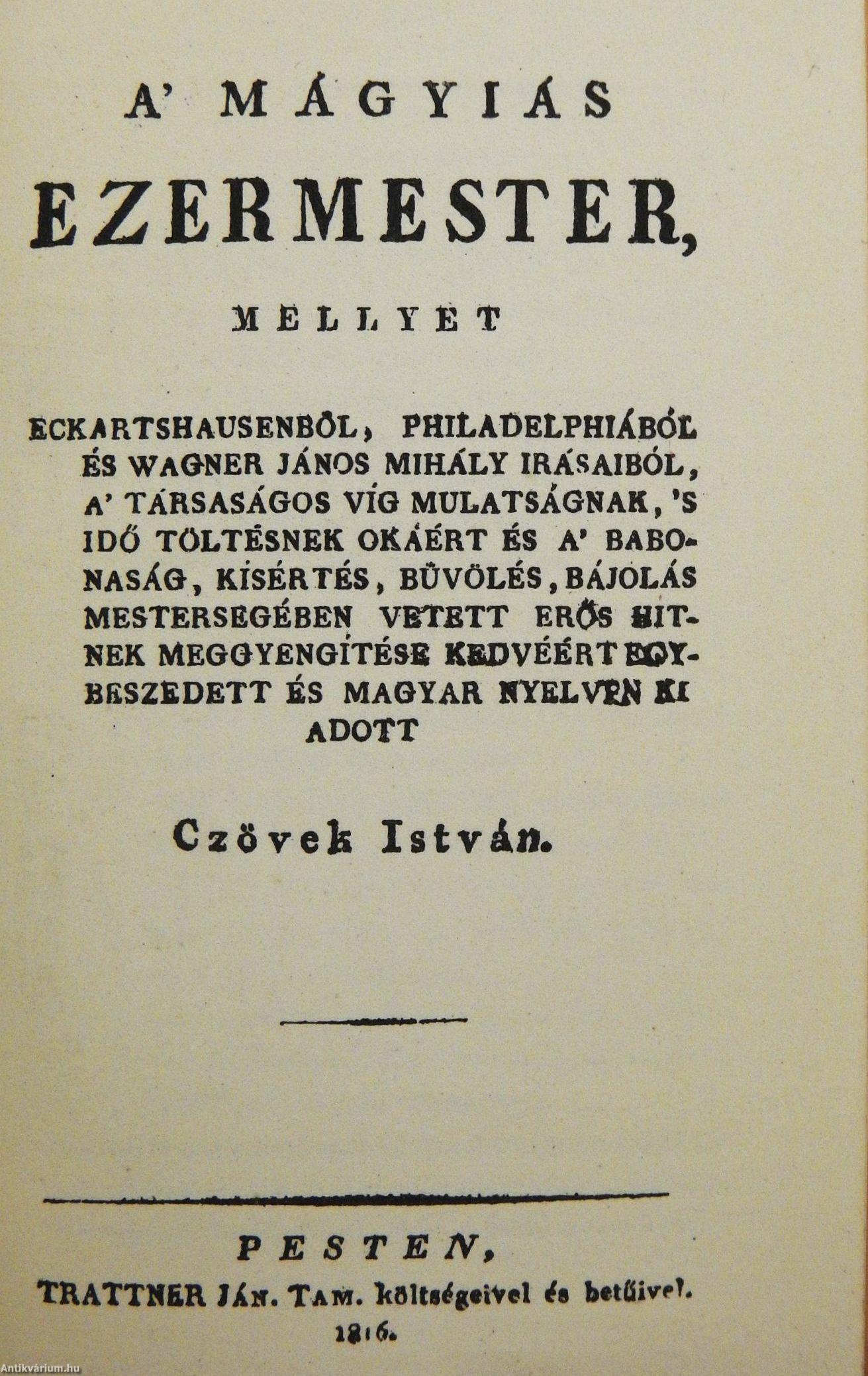 Ez az 1816-ban megjelent könyv ékesen szóló bizonyítéka annak, hogy a bűvészkedés szép mesterségének hazánkban már másfél évszázaddal ezelőtt nemes és magasszintű hagyományai voltak, s hogy már akkor is éltek olyan kitűnő és művelt bűvészeink, akiknek célja a szórakoztatáson felül a felvilágosítás és ismeretterjesztés volt - a fizikai, a vegytan, a természetrajz, a matematika, sőt az egészségtan és a lélektan területén.