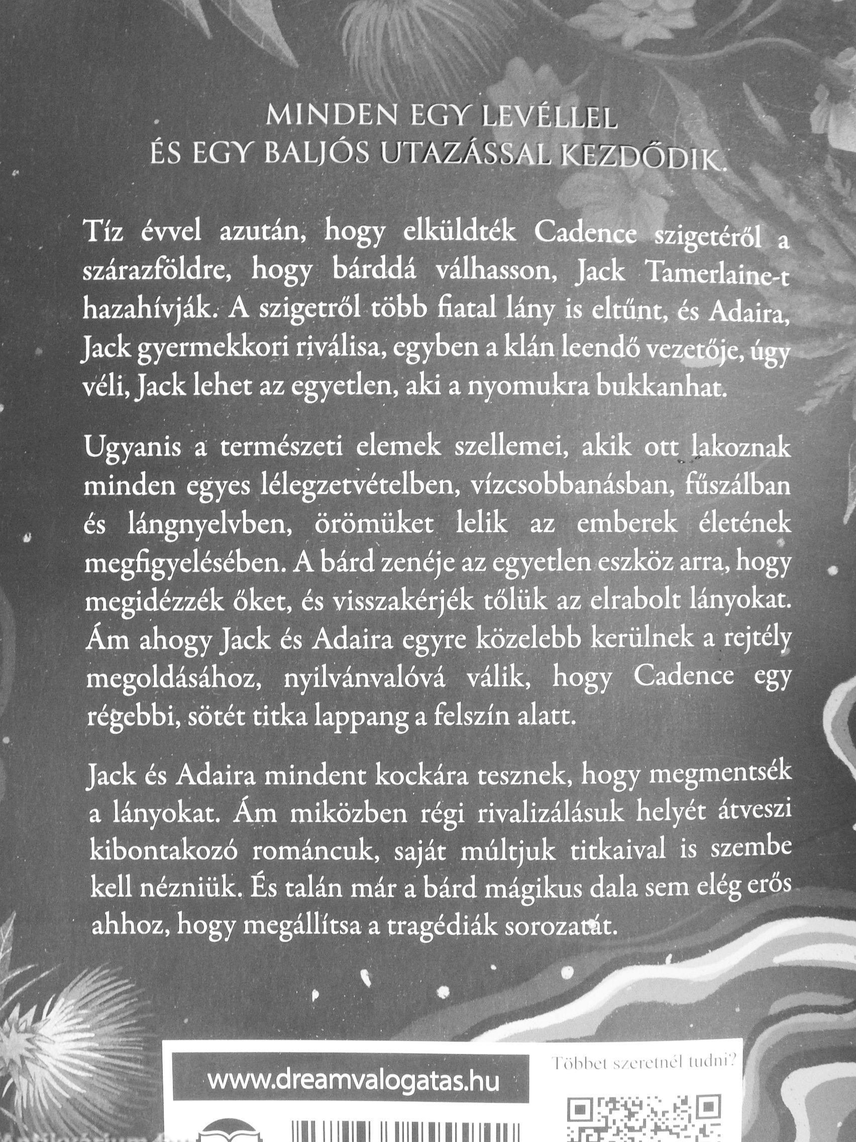 Ugyanis a természeti elemek szellemei, akik ott lakoznak minden egyes lélegzetvételben, vízcsobbanásban, fűszálban és lángnyelvben, örömüket lelik az emberek életének megfigyelésében. A bárd zenéje az egyetlen eszköz arra, hog) megidézzék őket, és visszakérjék tőlük az elrabolt lányokat, Ám ahogy Jack és Adaira egyre közelebb kerülnek a rejtélj megoldásához, nyilvánvalóvá válik, hogy Cadence eg) régebbi, sötét titka lappang a felszín alatt.