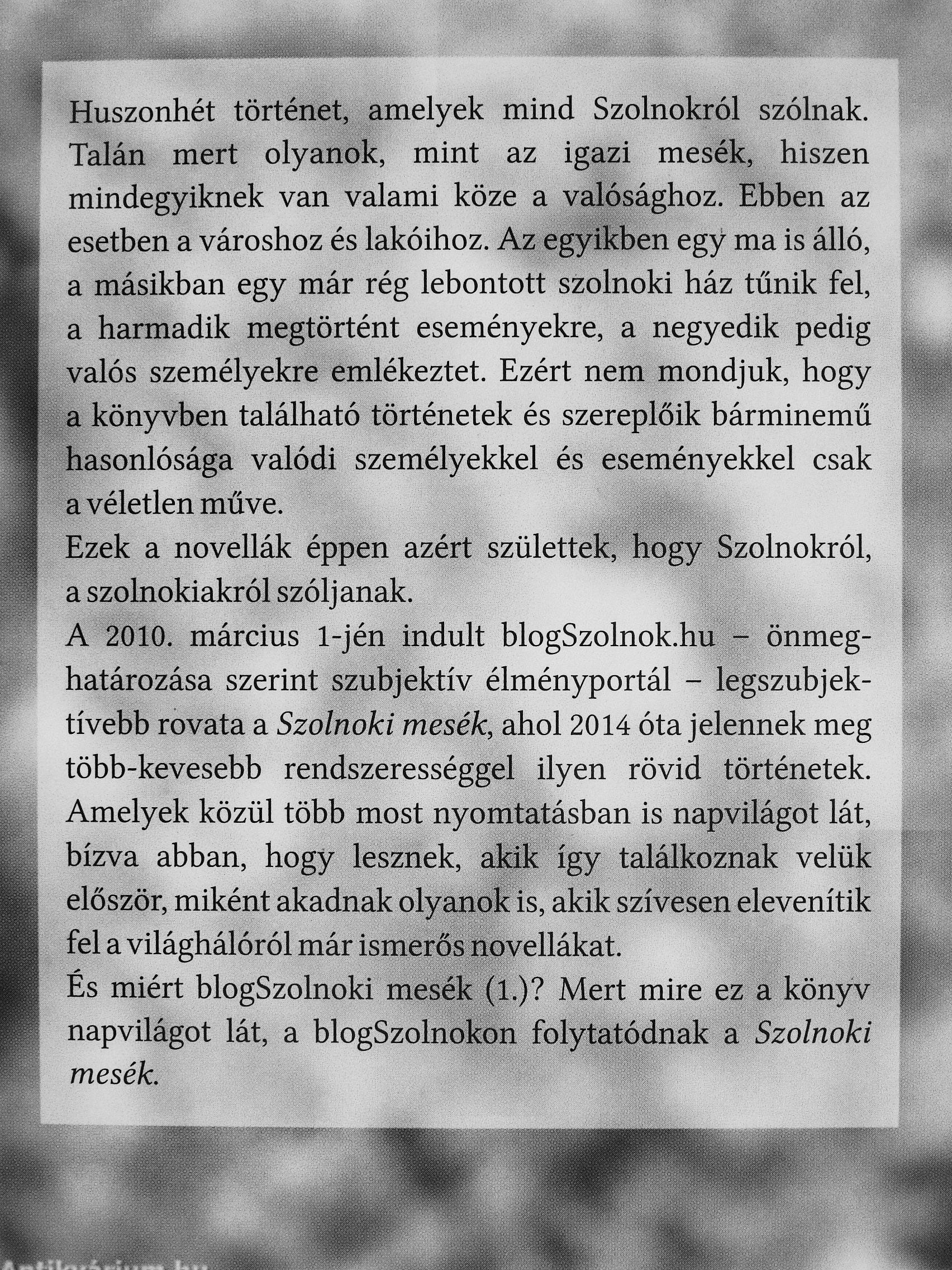 A 2010. március l-jén indult blogSzolnok.hu - önmeghatározása szerint szubjektív élményportál - legszubjek-tivebb rovata a Szolnoki mesék, ahol 2014 óta jelennek meg több-kevesebb rendszerességgel ilyen rövid történetek. Amelyek közül több most nyomtatásban is napvilágot lát, bízva abban, hogy lesznek, akik így találkoznak velük először, miként akadnak olyanok is, akik szívesen elevenítik fel a világhálóról már ismerős novellákat. És miért blogSzolnoki mesék (1.)? Mert mire ez a könyv napvilágot lát, a blogSzolnokon folytatódnak a Szolnoki mesék.