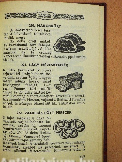 Új köntösben köszönti Háziasszonyainkat "A mi süteményes könyvünk". Értékes, hasznos könyvet célszerű formában és kivitelben nyújtunk új kiadásunkkal, mely az előző kiadások több mint háromszoros terjedelmében került sajtó alá. Köztudomású az a nagy népszerűség, mely az első kiadástól kísérte a kitünő házikincset jelentő "A mi süteményes könyvünk"-et. A népszerűségnek, és elterjedettségnek hihetetlen mértékét legjobban érzékeltethetjük azzal, ha egymásra raknánk az előző kiadások könyveit. Ez a könyvoszlop tíz és félszer olyan magas lenne, mint a budapesti Gellérthegy! Világviszonylatban pedig ez a hatalmas könyvtömeg több mint négy és félszer olyan magas oszlopot jelent, mint az egész világon közismert párizsi Eiffel-torony, mely a világ egyik legmagasabb építménye. Százezrei a magyar háziasszonyoknak nap-nap után forgatják a kitünő receptes könyvet és ezrével fordulnak hozzánk állandóan újabb és újabb érdeklődők a fogalommá vált Váncza-könyvért. A nagy népszerűség és az elfogyott roppant mennyiségű Váncza-könyvek elterjedésének okát már egyszeri átlapozásnál is megérti az olvasó. Még nem adott ki a világon egy sütőporgyár sem ilyen terjedelmű, képekkel gazdagon díszített süteményes receptkönyvet, mint amilyet Ön most a kezében tart. Dicsősége ez a haladó magyar iparnak és a törhetetlen magyar akarásnak. "A mi süteményes könyvünk" új nagy kiadásában a közel 500 jobbnál-jobb süteményrecept mellett részletesen megtanulhatja a háziasszony a cukrászmesterek sok fogását és türelemmel, gyakorlattal maga is mesteri munkát végezhet. A Váncza-könyvben a sütemények receptjeit tudatosan nem csoportosítottuk torták, teasütemények stb. fejezetekre. Újszerűleg gondoltuk el a sokszáz kép alkalmazása mellett azt a tervet, hogy a háziasszony a készítendő süteményt az irányító kép után válassza ki. Ez sikerült is, mert a többszázezer könyv ebben a tekintetben is úttörő munkát végzett. A régi szerkesztésű szakácskönyvek fárasztó, száraz receptfelsorolásai már unalmasak és bizony minden háziasszony szívesebben forgatja a minden receptnél képpel díszített változatos Váncza-könyvet. A háziasszonyok, mint közvetlen véleményekből halljuk, a megszokott és gyakrabban készülő süteményeket már nem is a név, hanem a kép után keresik a Váncza-könyvben, igazolva újításunk sikerét.