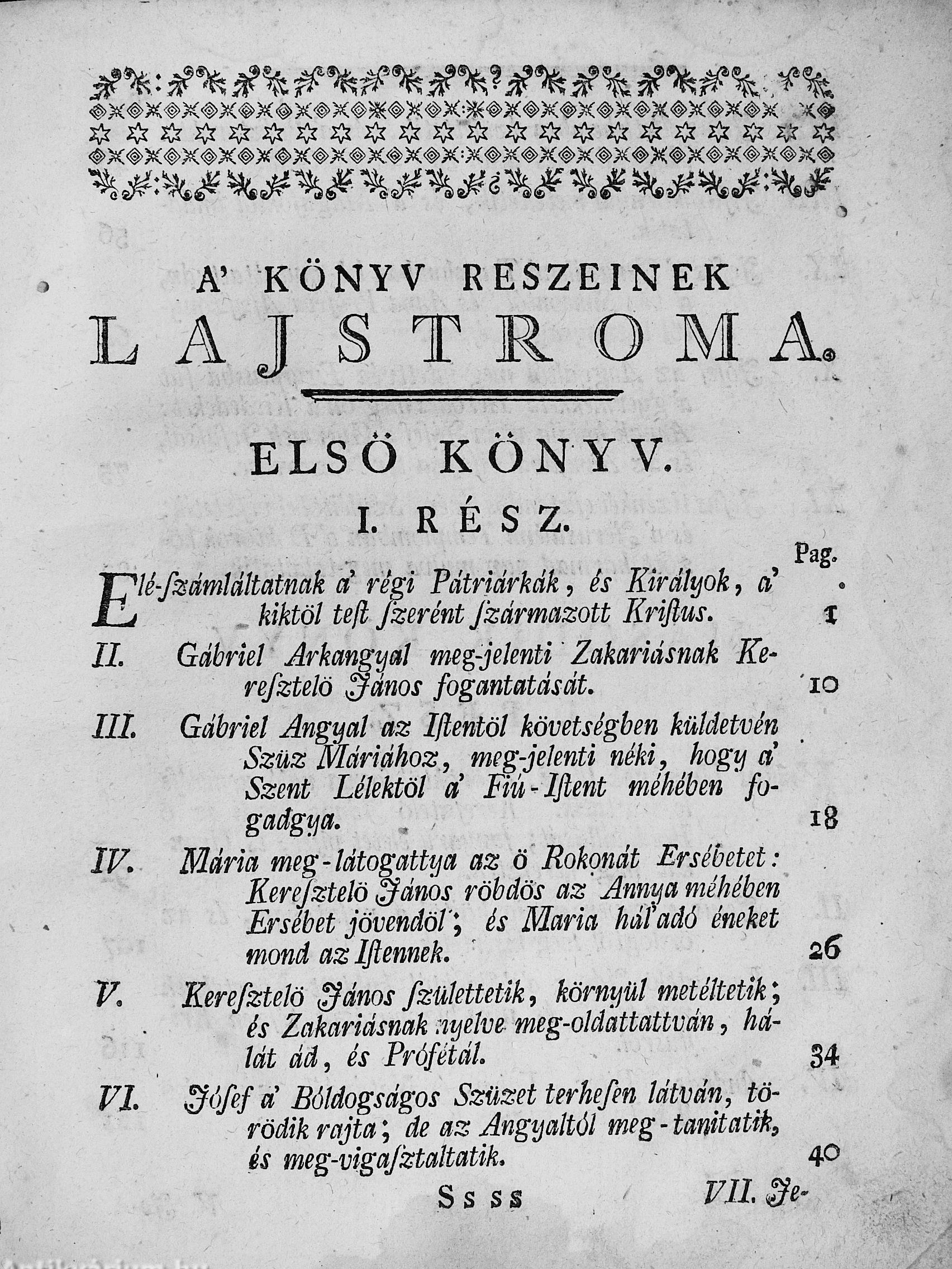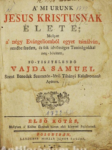 Mellyet a' négy Evángeliomból egyet tsinálván, rendbe szedett, és fok idvösséges Tanúságokkal meg- bövitett, fö-tisztelendö Vajda Samuel Szent Benedek Szerzetén-lévö Tihányi Kalastromnak Apátura/Elsö kötés mellyben a' Krisztus Életének három elsö könyvei foglaltatnak.