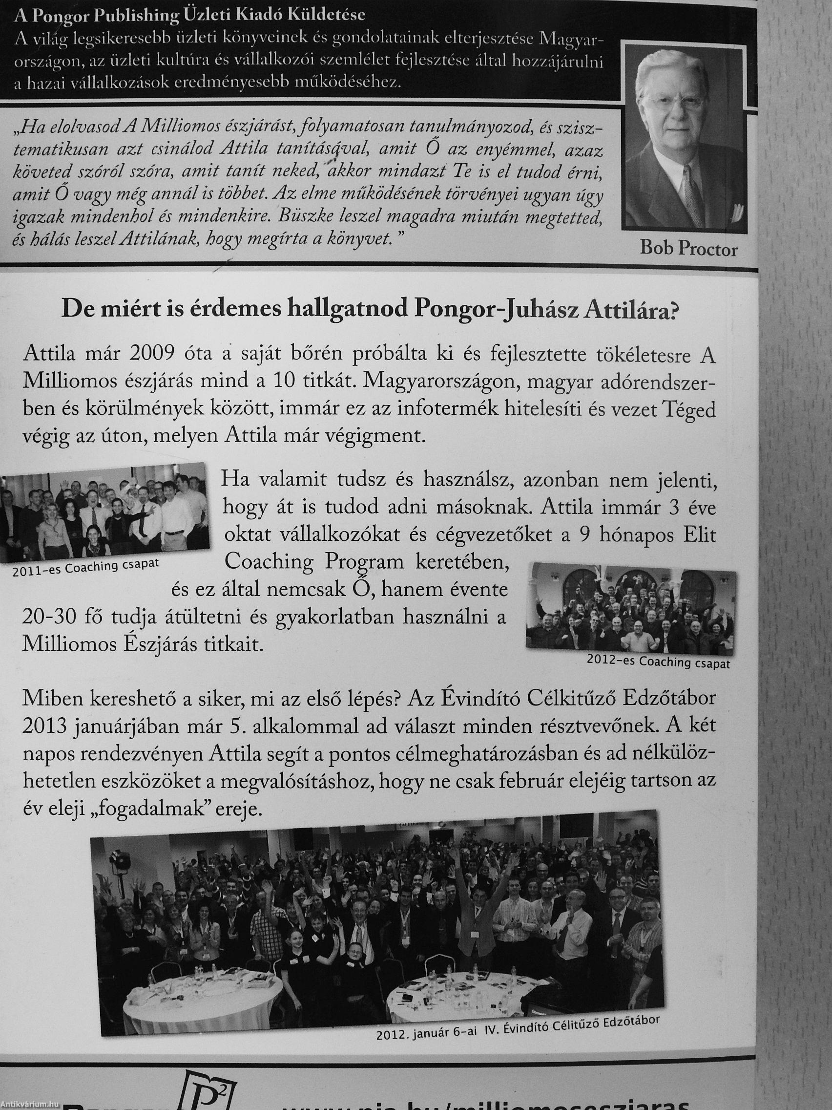 „Ha elolvasod A Milliomos észjárást, folyamatosan tanulmányozod, és szisztematikusan azt csinálod Attila tanításival, amit Ő az enyémmel, azaz követed szóról szóra, amit tanít neked, 'akkor mindazt Te is el tudod érni, amit Ő vagy még annál is többet. Az elme működésének törvényei ugyan úgy igazak mindenhol és mindenkire. Büszke leszel magadra miután megtetted, és hálás leszel Attilának, hogy megírta a könyvet. " p^Qj-^Qy