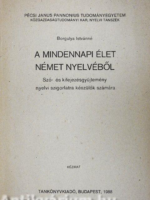 Az itt kézbe vett "A mindennapi élet német nyelvéből" , e témák szerint rendezett szó- és kifejezésgyűjtemény - mely igyekszik felölelni a mai hétköznapok leggyakoribb beszélgetési témáit, beleértve a legutóbbi évek problémaköreit is, mint a családtervezés, lakáskérdés, stb. - azoknak a huzamosabb ideje német nyelvet tanulóknak kíván segítséget nyújtani, akik elsajátították már a nyelv alapvető grammatikáját, tanulmányuk során jelentős szókincsre tettek szert a legváltozatosabb témakörökben, s most rendezni, csiszolni és bővíteni szeretnék az eddig megtanultakat a mindennapi élet tárgyköreiben.
