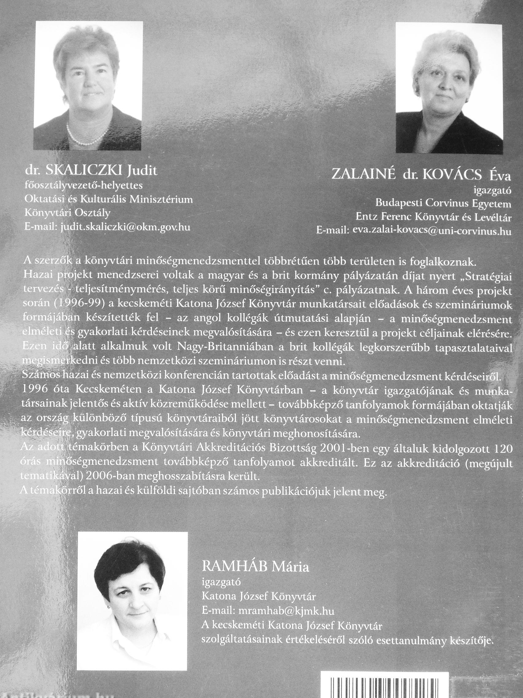 A szerzők a könyvtári minőségmenedzsmenttel többrétűén több területen is foglalkoznak. Hazai fjrojekt menedzserei voltak a magyar és a brit kormány pályázatán díjat nyert „Stratégiai tci\'c/c:\s - teljesítménymérés, teljes körű minőségirányítás" c. pályázatnak. A három éves projekt során (1996-99) a kecskeméti Katona József Könyvtár munkatársait előadások és szemináriumok formájában készítették fel - az angol kollégák útmutatási alapján - a minőségmenedzsment clnick ü és gyakorlati kérdéseinek megvalósítására - és ezen keresztül a projekt céljainak elérésére. Ezen idö <alatt alkalmuk volt Nagy-Britanniában a brit kollégák legkorszerűbb tapasztalataival megismerkedni és több nemzetközi szemináriumon is részt venni. 7 Száníos hazai és nemzetközi konferencián tartottak előadást a minőségmenedzsment kérdéseiről. ¦ ¦ 1996 óta Kecskeméten a Katona József Könyvtárban - a könyvtár igazgatójának és munka-' társainak jelentős és aktív közreműködése mellett - továbbképző tanfolyamok formájában oktatják _ az ország különböző típusú könyvtáraiból jött könyvtárosokat a minőségmenedzsment elméleti -Jt^kérdjéseiiie, gyakorlati megvalósítására és könyvtári meghonosítására.