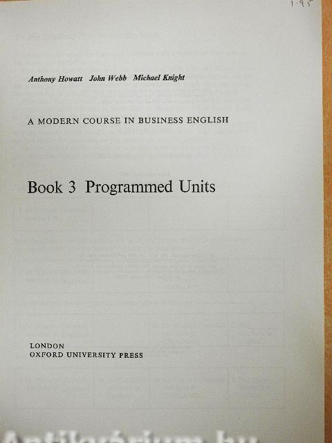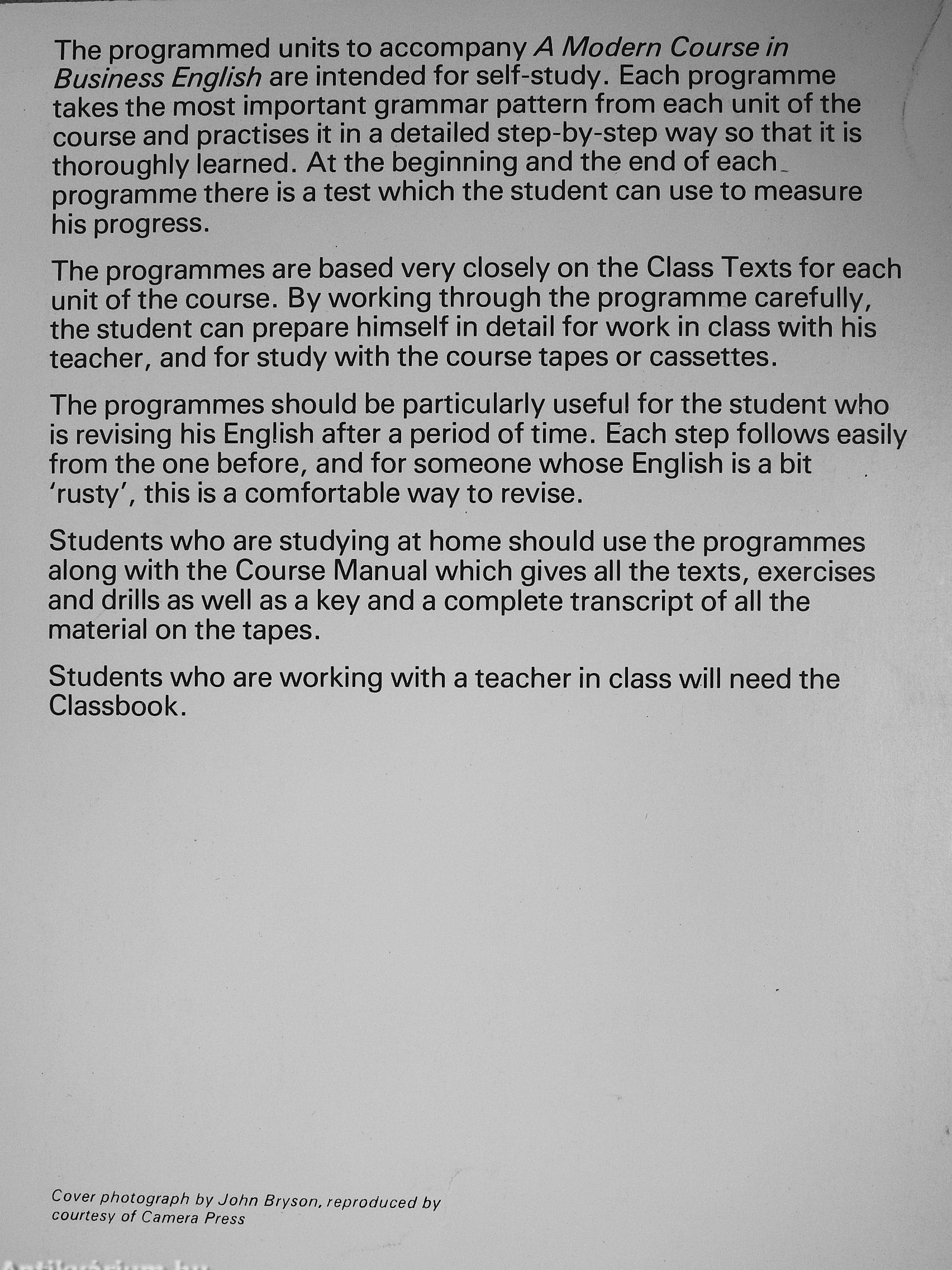 The programmed units to accompanyModern Course in Business English are intended for self-study. Each programme takes the most important grammar pattern from each unit of the course and practises it in a detailed step-by-step way so that it is thoroughly learned. At the beginning and the end of each, programme there is a test which the student can use to measure his progress.
