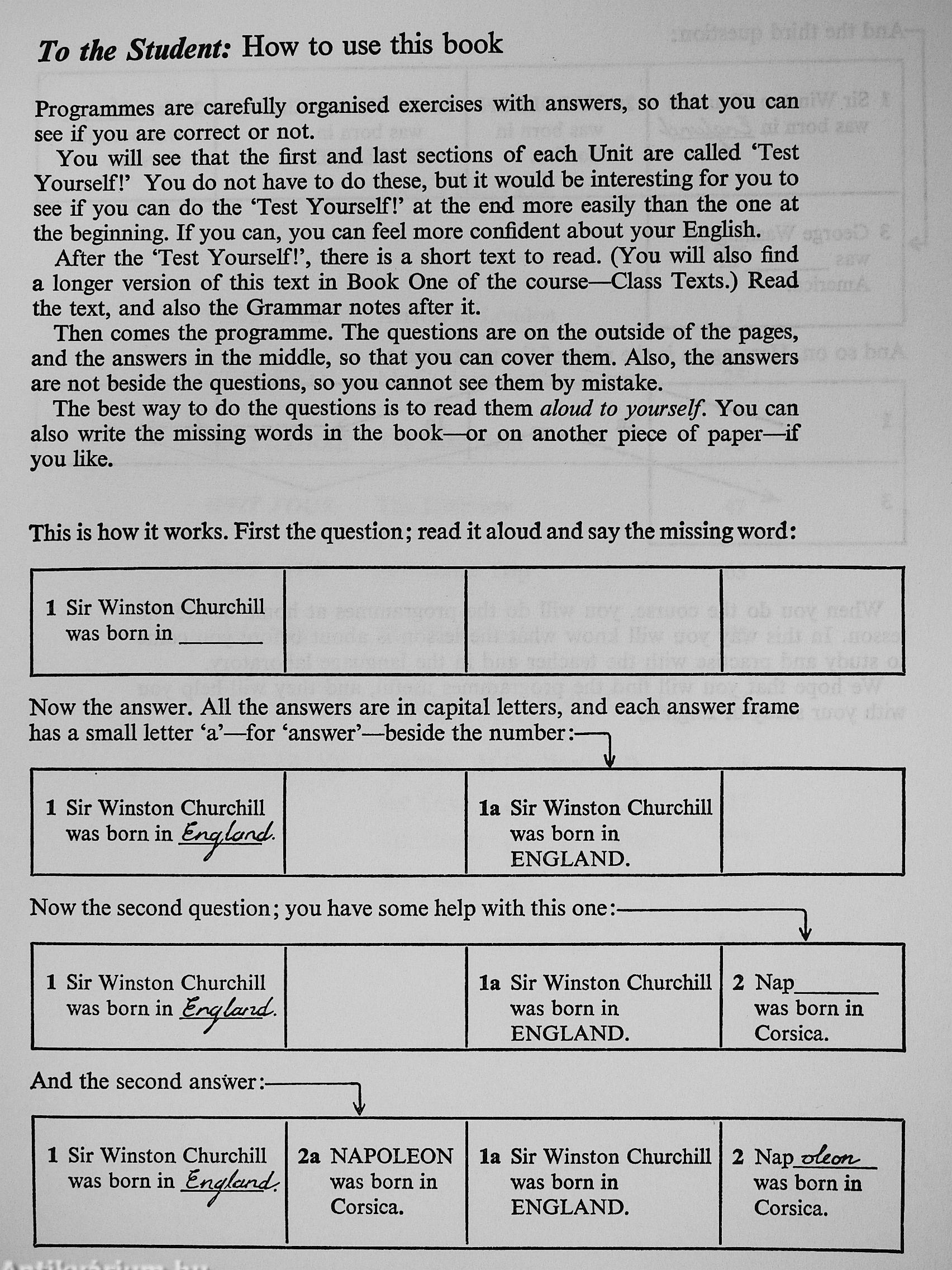 The programmes are based very closely on the Class Texts for each unit of the course. By working through the programme carefully, the student can prepare himself in detail for work in class with his teacher, and for study with the course tapes or cassettes.