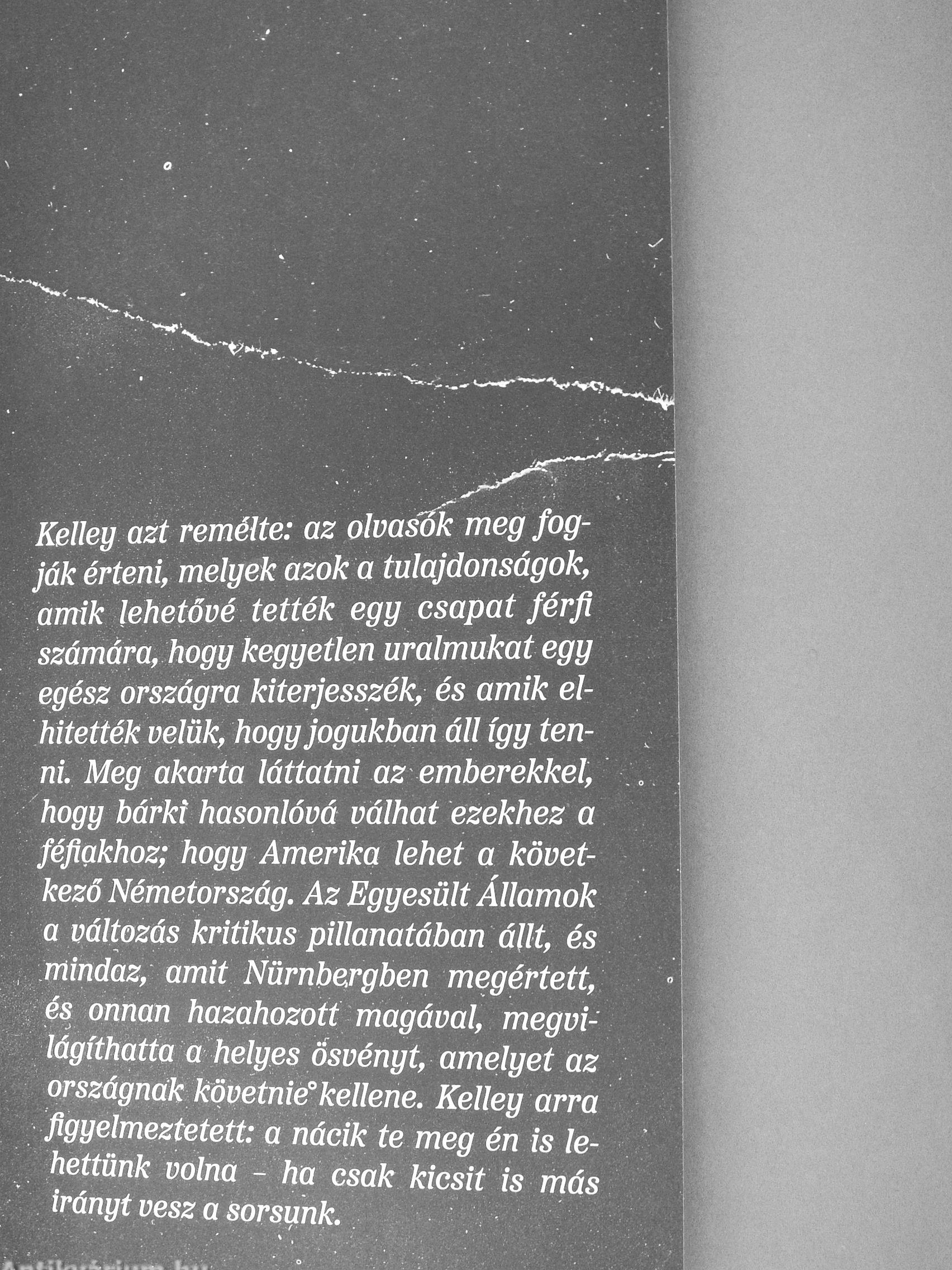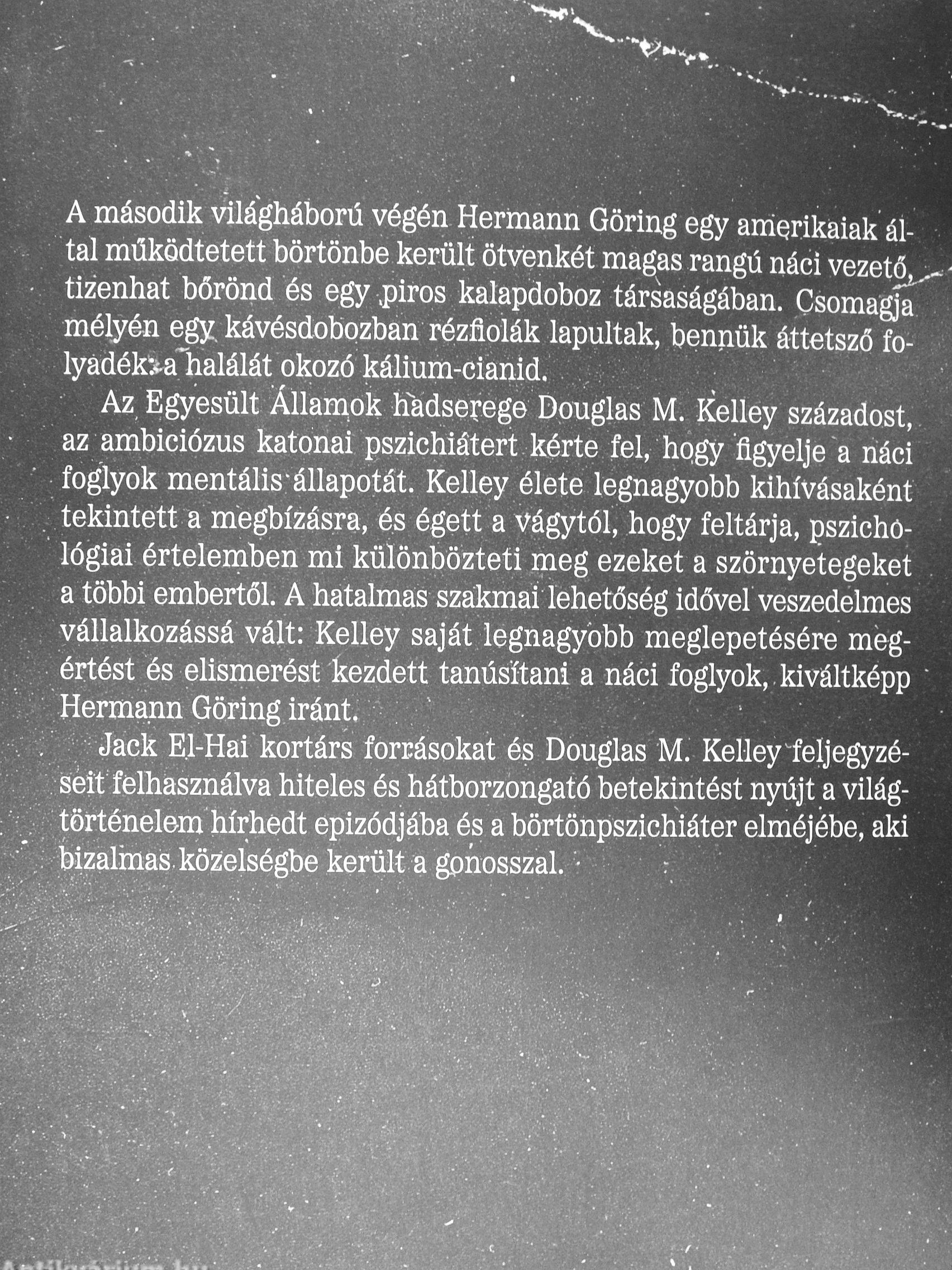 Jack El-Hai kortárs foruásokat és Douglas M. Kelley feljegyzéseit felhasználva hiteles és hátborzongató betekintést nyújt a világtörténelem hírhedt epizódjába és a börtönpszjchiáter elméjébe, aki bizalmas, közelségbe került a gonosszal. - :