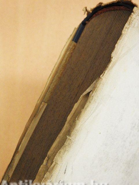 A védőborító elszíneződött, széle szakadozott. A felső lapélek foltosak.
