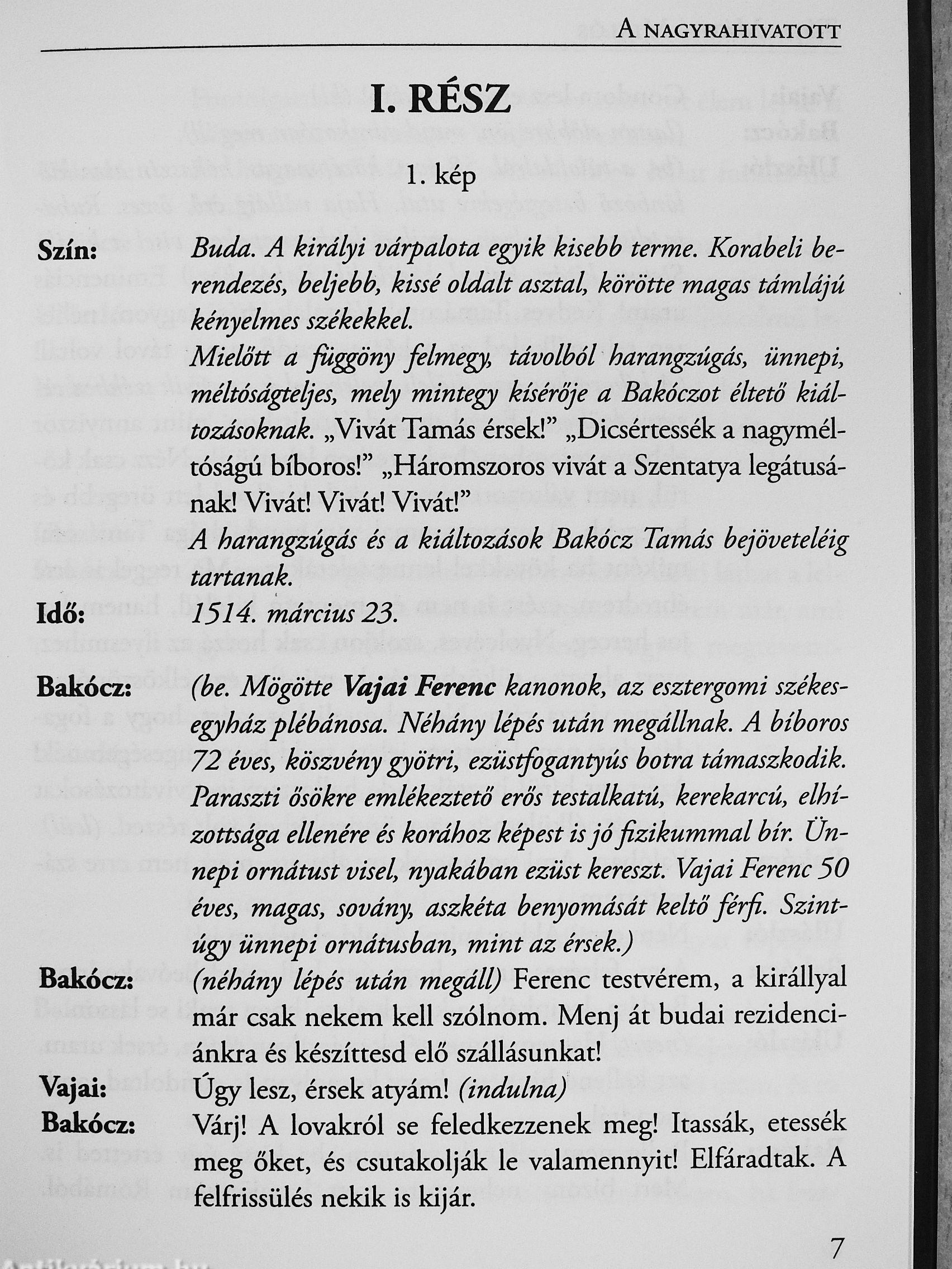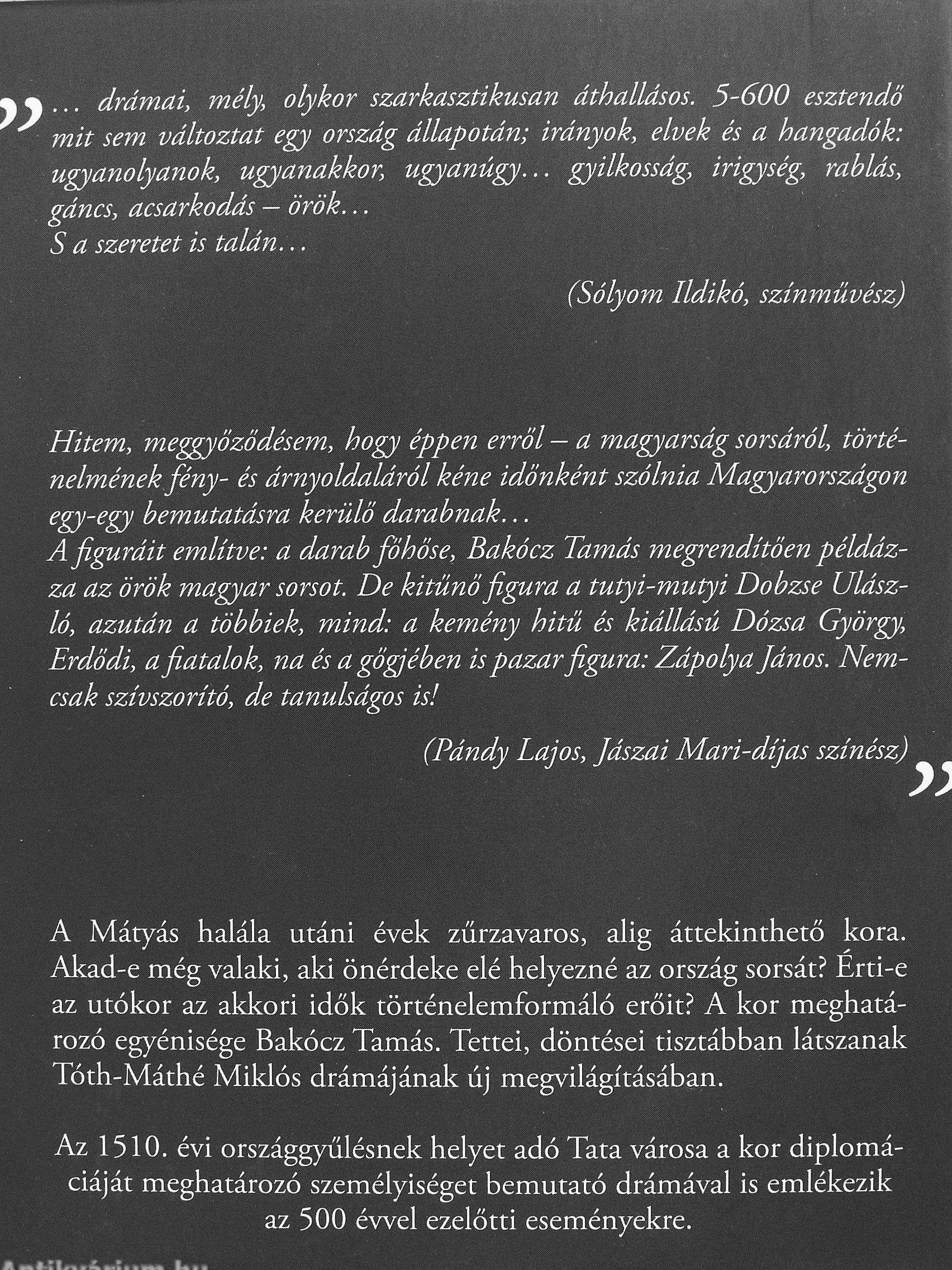 A figuráit említve: a darab főhőse, Bakócz Tamás megrendítően példázza az örök magyar sorsot. De kittínőfigura a tutyi-mutyi Dobzse Ulászló, azután a többiek, mind: a kemény hitű és kiállású Dózsa György, Erdődi, a fiatalok, na és a gőgjében is pazar figura: Zápolya fános. Nem-