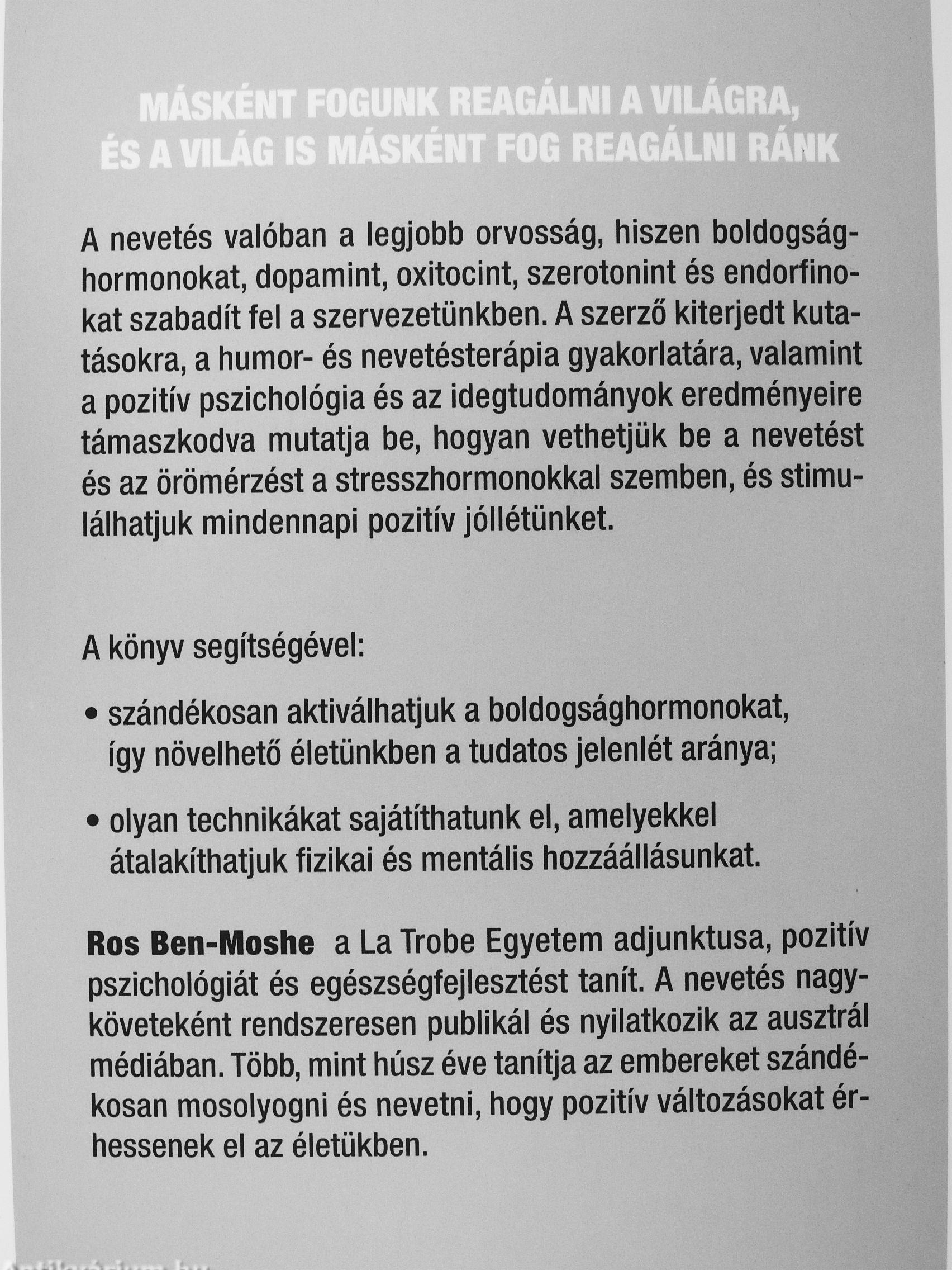 A nevetés valóban a legjobb orvosság, hiszen boldogsághormonokat, dopamint, oxitocint, szerotonint és endorfino-kat szabadít fel a szervezetünkben. A szerző kiterjedt kutatásokra, a humor- és nevetésterápia gyakorlatára, valamint a pozitív pszichológia és az idegtudományok eredményeire támaszkodva mutatja be, hogyan vethetjük be a nevetést és az örömérzést a stresszhormonokkal szemben, és stimulálhatjuk mindennapi pozitív jóllétünket.