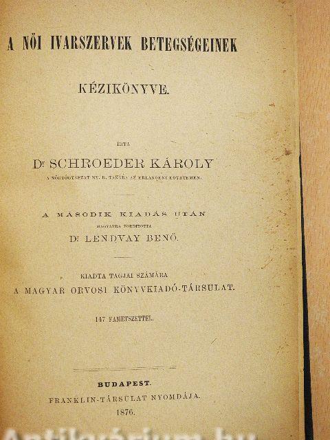 | Megjegyzés: | Nyomtatta a Franklin-Társulat nyomdája, Budapest. 147 fekete-fehér fametszettel illusztrálva. Írta Dr. Schroeder Károly a nőgyógyászat ny. r. tanára az Erlangeni Egyetemen. A második kiadás után magyarra forditotta Dr. Lendvay Benő. |