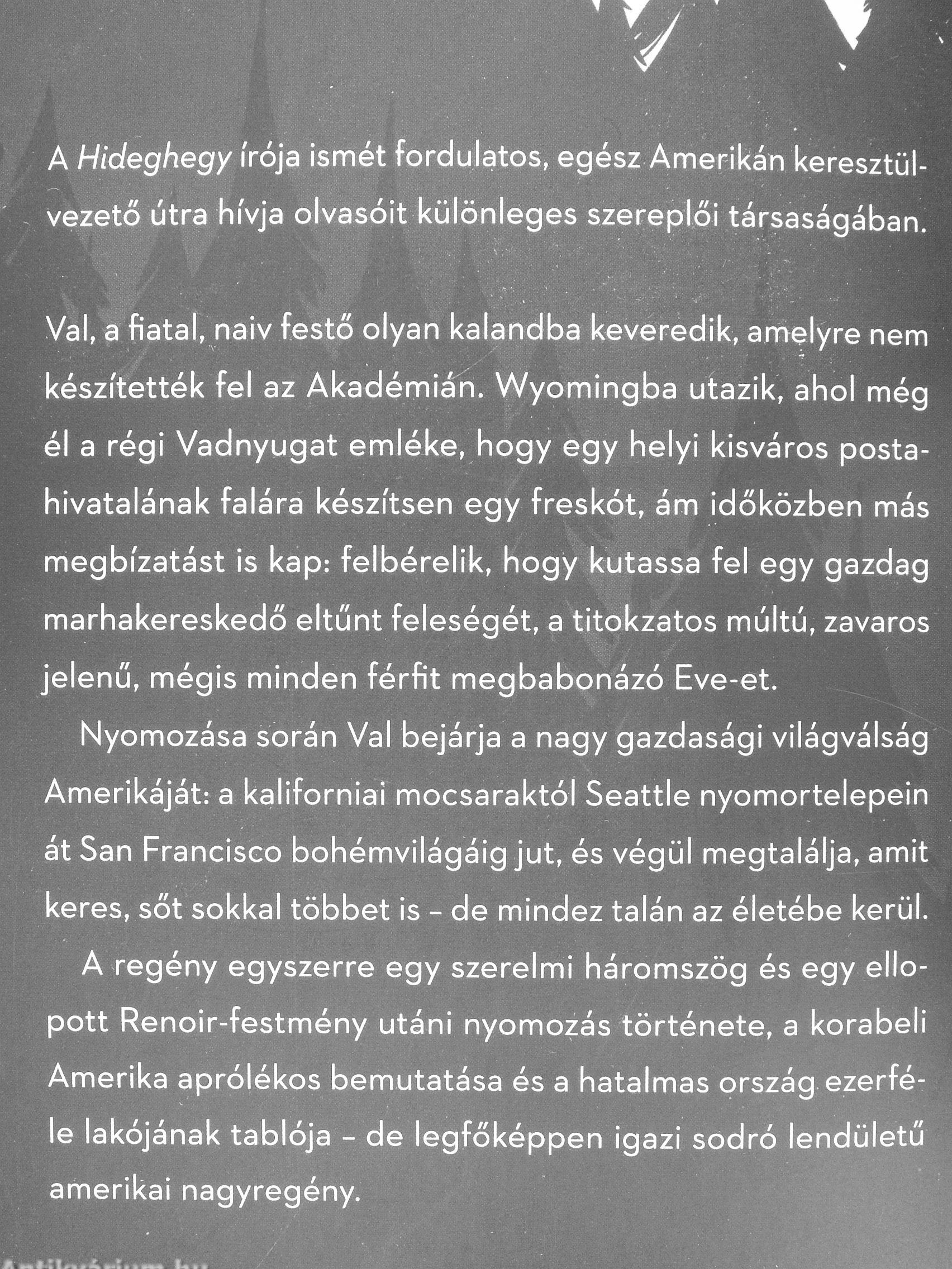 A regény egyszerre egy szerelmi háromszög és egy ellopott Renoir-festmény utáni nyomozás története, a korabeli Amerika aprólékos bemutatása és a hatalmas ország ezerféle lakójának tablója - de legfőképpen igazi sodró...