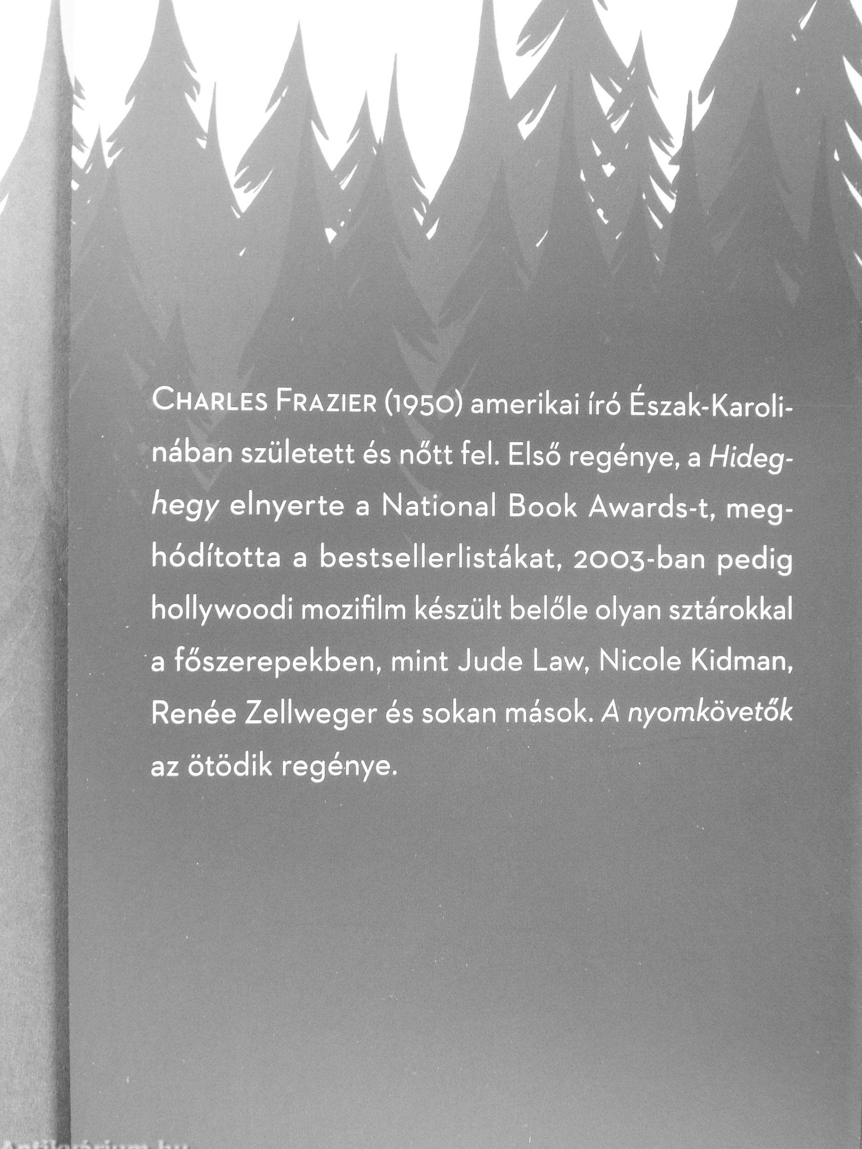 Charles Frazier (1950) amerikai író Észak-Karoli- nában született és nőtt fel. Első regénye, a Hideg-hegy elnyerte a National Book Awards-t, meg-. hódította a bestsellerlistákat, 2003-ban pedig , hollywoodi mozifilm készült belőle olyan sztárokkal a főszerepekben, mint Jude Law, Nicole Kidman, Renée Zellweger és sokan mások. A nyomkövetők az ötödik reqénye.