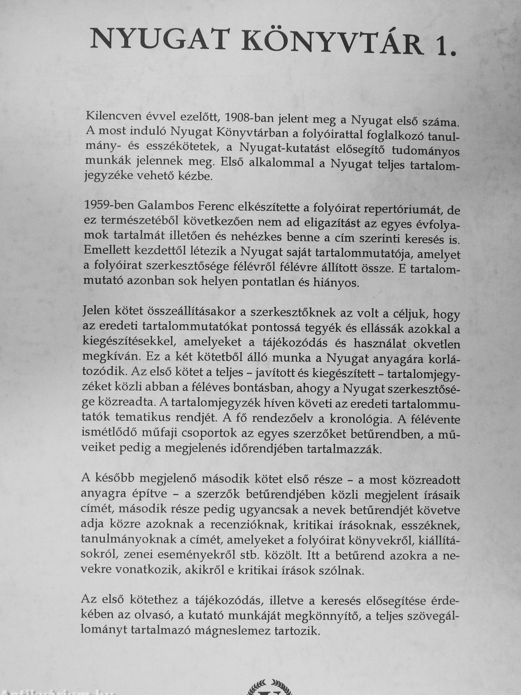 Kilencven évvel ezelőtt, 1908-ban jelent meg a Nyugat első száma. A most induló Nyugat Könyvtárban a folyóirattal foglalkozó tanulmány- és esszékötetek, a Nyugat-kutatást elősegítő tudományos munkák jelennek meg. Első alkalommal a Nyugat teljes tartalomjegyzéke vehető kézbe.