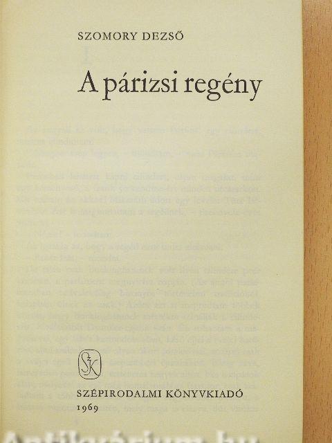Szomory Dezső születésének centenáriumára jelenik meg a kiváló író legszínesebb műve, prózairodalmunk maradandó értékű, klasszikus alkotása, A párizsi regény, 1890-ben a fiatal Szomory a katonáskodás elől Párizsba menekült s csak tizenhét évvel később térhetett haza, amnesztiával. A párizsi regény alapanyagát ennek a tizenhét esztendőnek élményeiből desztillálta az író, a honvágy, a szegénység és magány okozta szenvedéseket, az első igazi írások alkotásának lázait: ifjúságának világát idézte fel. Az önarckép éppoly vonzó a maga komoly és ironikus mivoltában, mint amilyen megkapó a háttér, a századforduló különös hangulatú Párizsa s az itt élő magyarok arcképcsarnoka, ahol Munkácsy Mihály vagy Türr István éppen úgy szerepel, mint "Szklezenzsé", a vígjátékba illő rokonfiú. Akár Reményi Ede, a világhírű hegedűművész családjának körébe, akár Bertha Sándor sivár otthonába vezet bennünket, mindig rendkívüli érzékenységgel megfigyelt és ábrázolt jellemekkel, sorsokkal találkozunk.