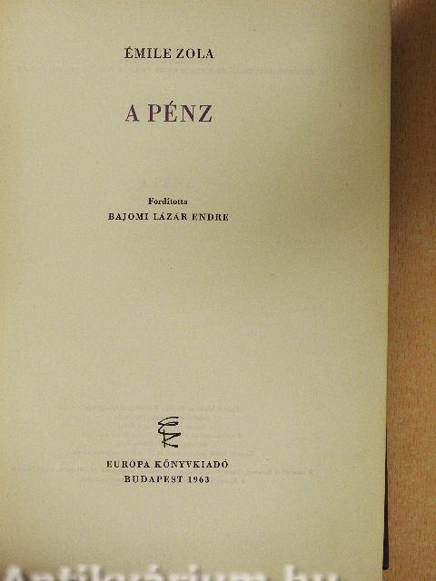 A pénz 1891-ben jelent meg a Rougon-Macquart ciklus köteteként, de szorosan kapcsolódik a ciklus 1872-es születésű második kötetéhez, A hajszához, szinte tovább meséli Aristide Rougon - vagyis most már Sacard - történetét. Ennek a pénzt istenként tisztelő, a spekulációból életelvet kovácsoló nagystílű, gátlástalan tőzsdelovagnak a figurája valóságos, történeti alakok ötvözete, azoké, akik a végnapjait élő második császárság tőzsdepalotájában rohamra vezetik millióikat, hatalmas részvényhadseregüket. Zola, a tömegjelenetek mestere, nagy erővel ábrázolja a profitra éhes üzérek, a gátlástalan börzelovagok, a minden hájjal megkent alkuszok siserahadát - és azokat is, akiket elnyelnek, legázolnak kegyetlenül a pénzhajszában: a hiszékeny kisemberek tömegét.