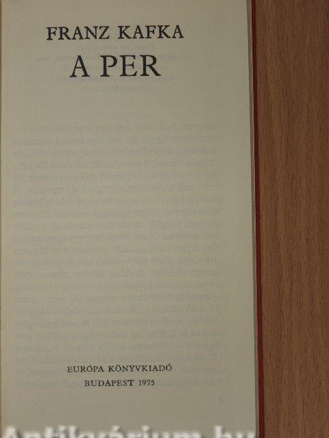 Josef K. fejet hajt a pokoli szükségszerűség előtt. Tehetetlenül áll a "világrenddé avatott hazugság" előtt, akár az író maga, aki lidércnyomásos látomásaiban megjárván kora poklát, szintén áldozatul esett ennek a vilgárendnek. Pusztulásra ítélte hagyatékát is, e pokoljárás riasztó dokumentumát, az utókor azonban fölfedezte benne a katartikus hatású művészi erőt - és ez avatja ma klasszikus, megrendítő olvasmánnyá mindenekelőtt főművét, A Per-t. Vissza