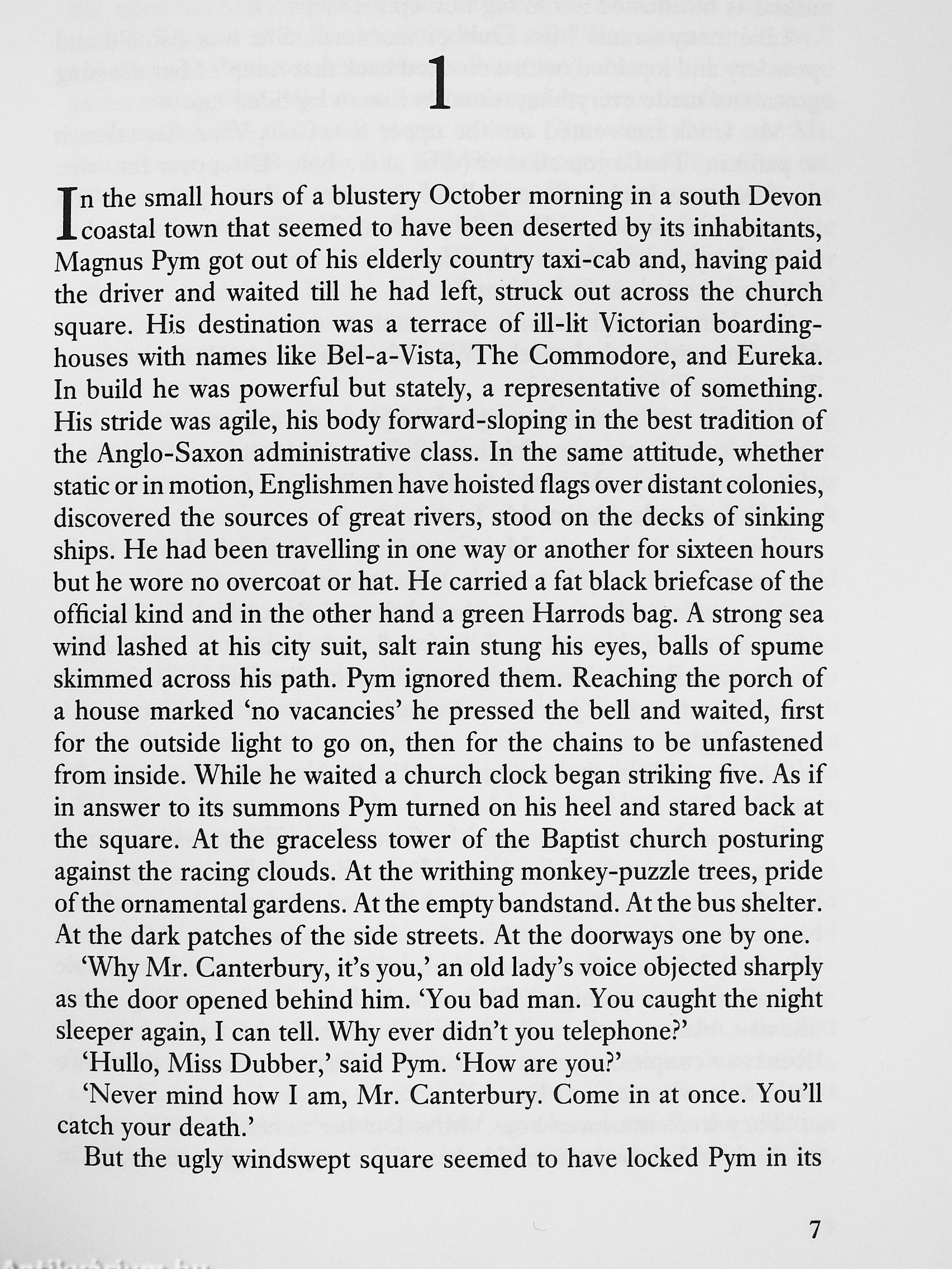 The chase is on: for a missing person, for the truth about a charming man. It is conducted by Pym himself as well as by his pursuers. While Pym with desperate affection recounts his quest for love and faith, and his first steps in deception, his pursuers unearth such a trail of duplicity as would make Kim Philby look like a patriotic boy scout. Yet the man they all loved remains mysteriously, maddeningly intact.