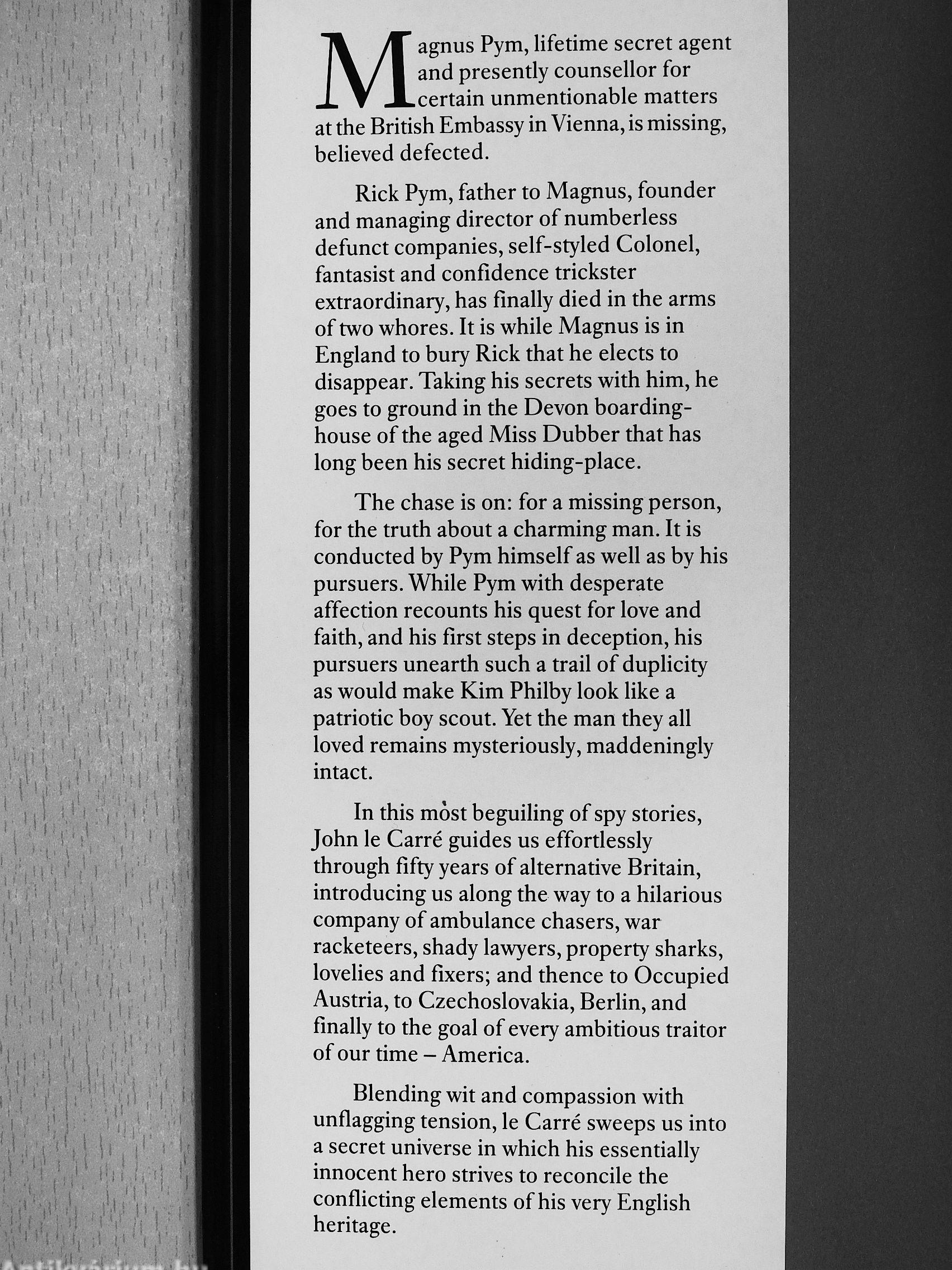 Magnus Pym, lifetime secret agent and presently counsellor for certain unmentionable matters at the British Embassy in Vienna, is missing, believed defected.
