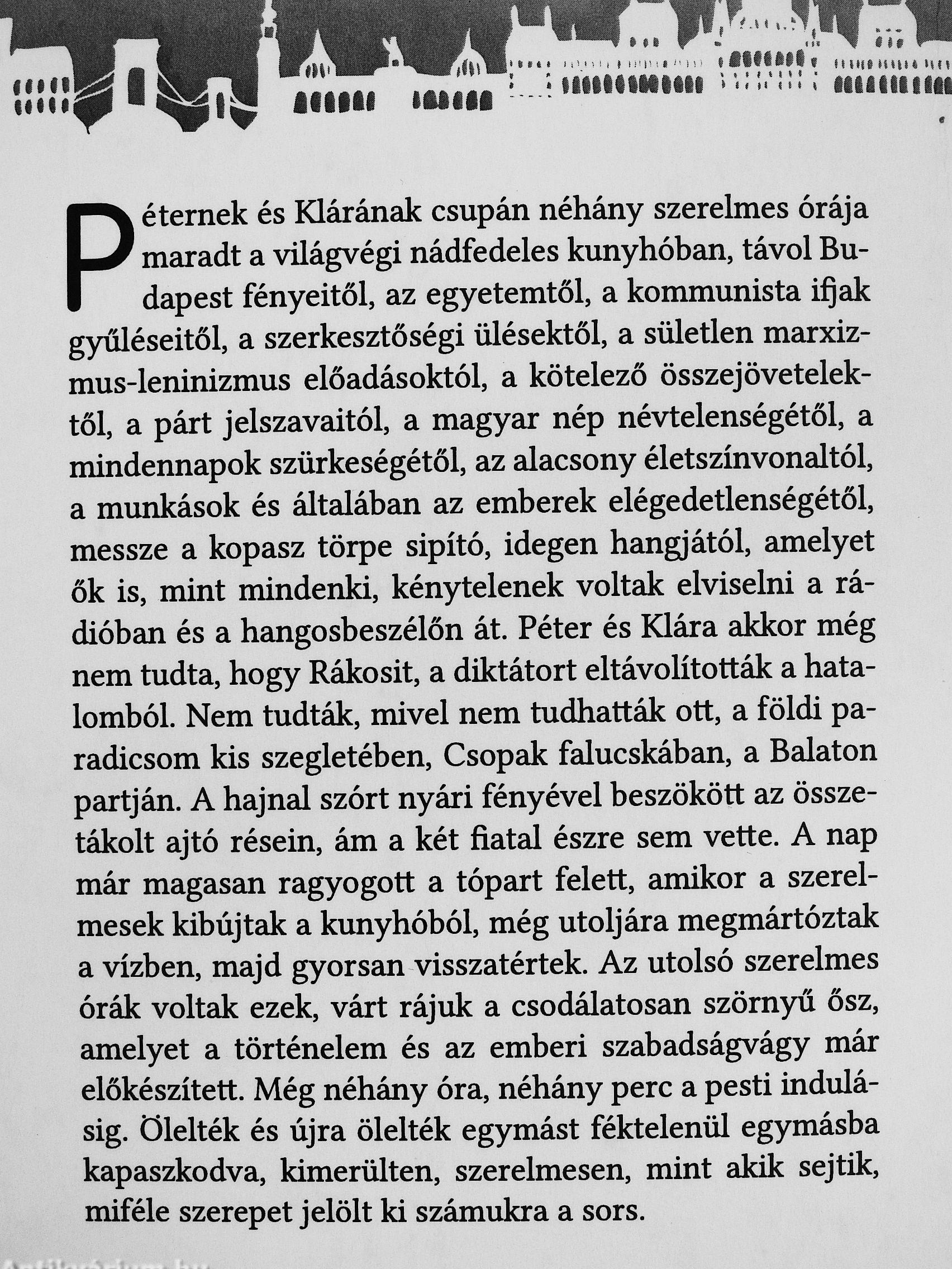 Péternek és Klárának csupán néhány szerelmes órája maradt a világvégi nádfedeles kunyhóban, távol Budapest fényeitől, az egyetemtől, a kommunista i^ak gyűléseitől, a szerkesztőségi ülésektől, a sületlen marxizmus-leninizmus előadásoktól, a kötelező összejövetelektől, a párt jelszavaitól, a magyar nép névtelenségétől, a mindennapok szürkeségétől, az alacsony életszínvonaltól, a munkások és általában az emberek elégedetlenségétől, messze a kopasz törpe sipító, idegen hangjától, amelyet ők is, mint mindenki, kénytelenek voltak elviselni a rádióban és a hangosbeszélőn át. Péter és Klára akkor még nem tudta, hogy Rákosit, a diktátort eltávolították a hatalomból. Nem tudták, mivel nem tudhatták ott, a földi paradicsom kis szegletében, Csopak falucskában, a Balaton partján. A hajnal szórt nyári fényével beszökött az összetákolt ajtó résein, ám a két fiatal észre sem vette. A nap már magasan ragyogott a tópart felett, amikor a szerelmesek kibújtak a kunyhóból, még utoljára megmártóztak a vízben, majd gyorsan visszatértek. Az utolsó szerelmes órák voltak ezek, várt rájuk a csodálatosan szörnyű ősz, amelyet a történelem és az emberi szabadságvágy már előkészített. Még néhány óra, néhány perc a pesti indulásig. Ölelték és újra ölelték egymást féktelenül egymásba kapaszkodva, kimerülten, szerelmesen, mint akik sejtik, miféle szerepet jelölt ki számukra a sors.