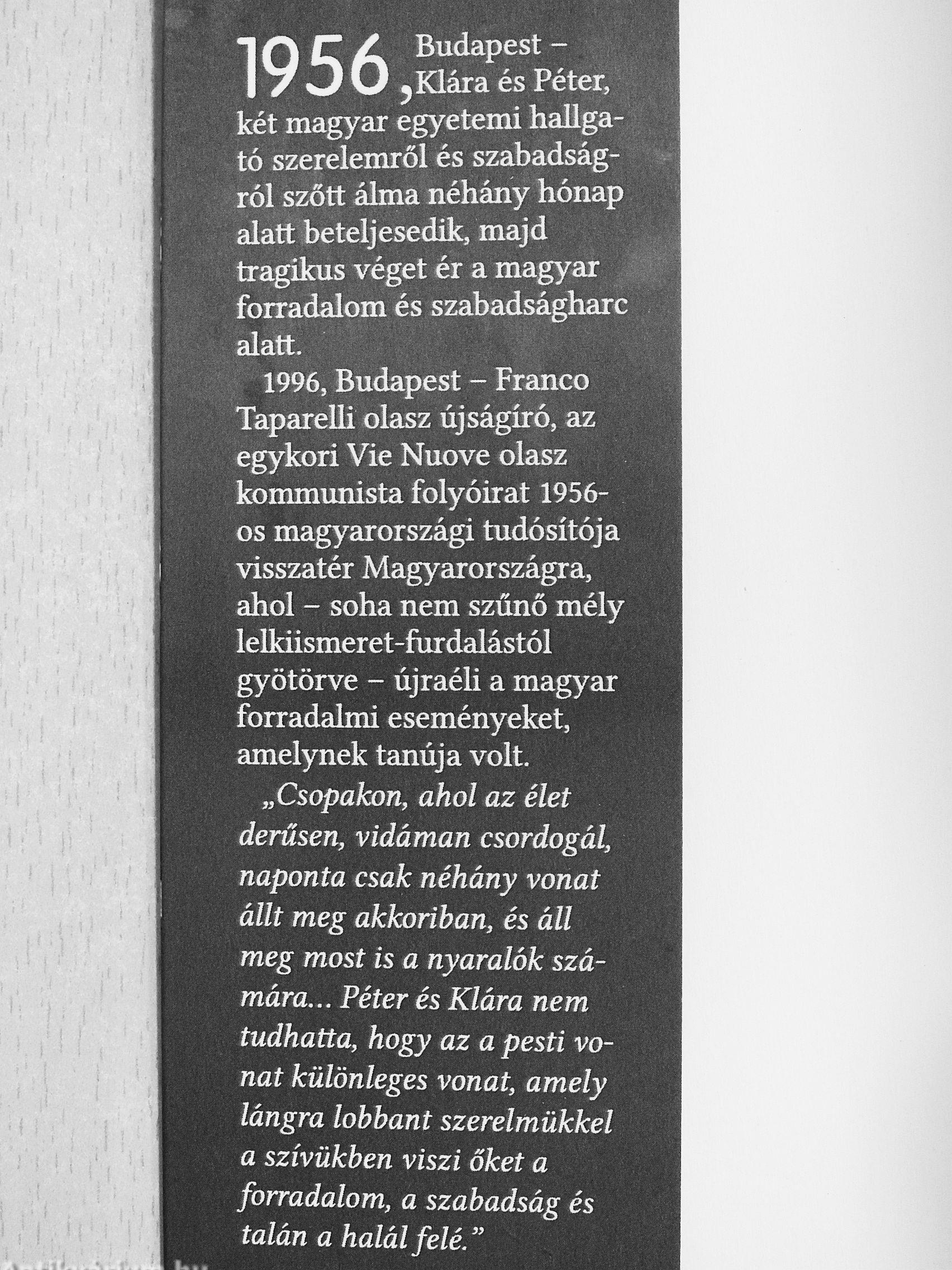 „Csopakon, ahol az élet derűsen, vidáman csordogál, naponta csak néhány vonat állt meg akkoriban, és áll meg most is a nyaralók számára Péter és Klára nem tudhatta, hogy az a pesti vonat különleges vonat, amely lángra lobbant szerelmükkel a szívükben viszi őket a forradalom, a szabadság és talán a halál felé."