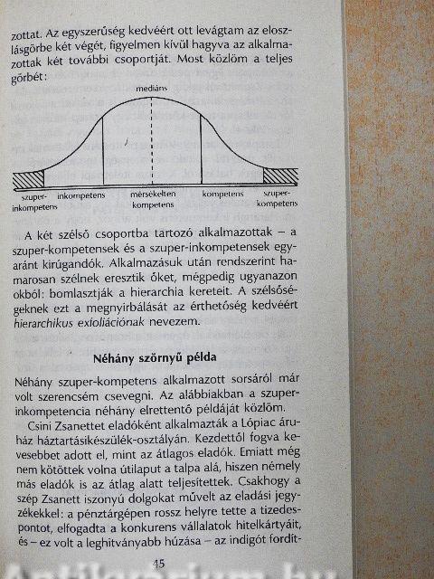 Noha vannak emberek, akik hozzáértően látják el feladataikat, mások kompetenciája nem megfelelő. Ezek rendszerint elpuskázzák a dolgaikat, akadályozzák munkatársaikat munkájuk végzésében, és rontják a szervezet működésének hatékonyságát. Logikus volt arra a következtetésre jutnom, hogy a világ minden munkájához létezik valahol valaki, aki nem képes a szóban forgó feladat elvégzésére. Megfelelő időben és kellő számú előléptetés után az illető végül megkapja ezt a munkakört!