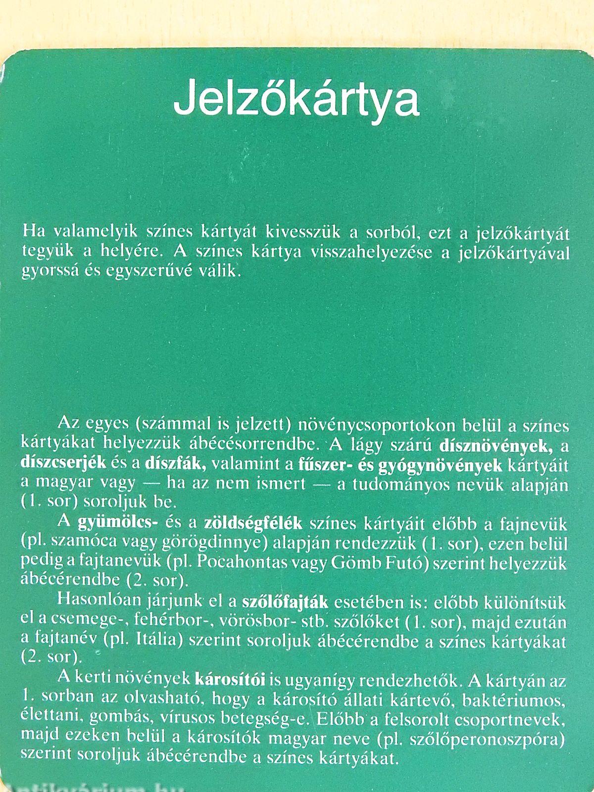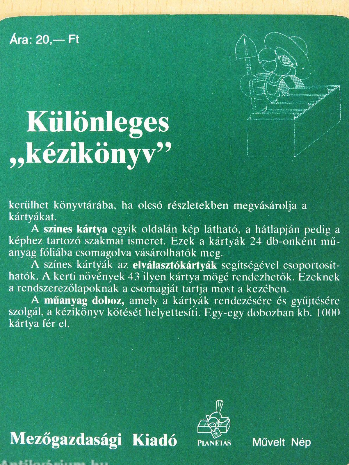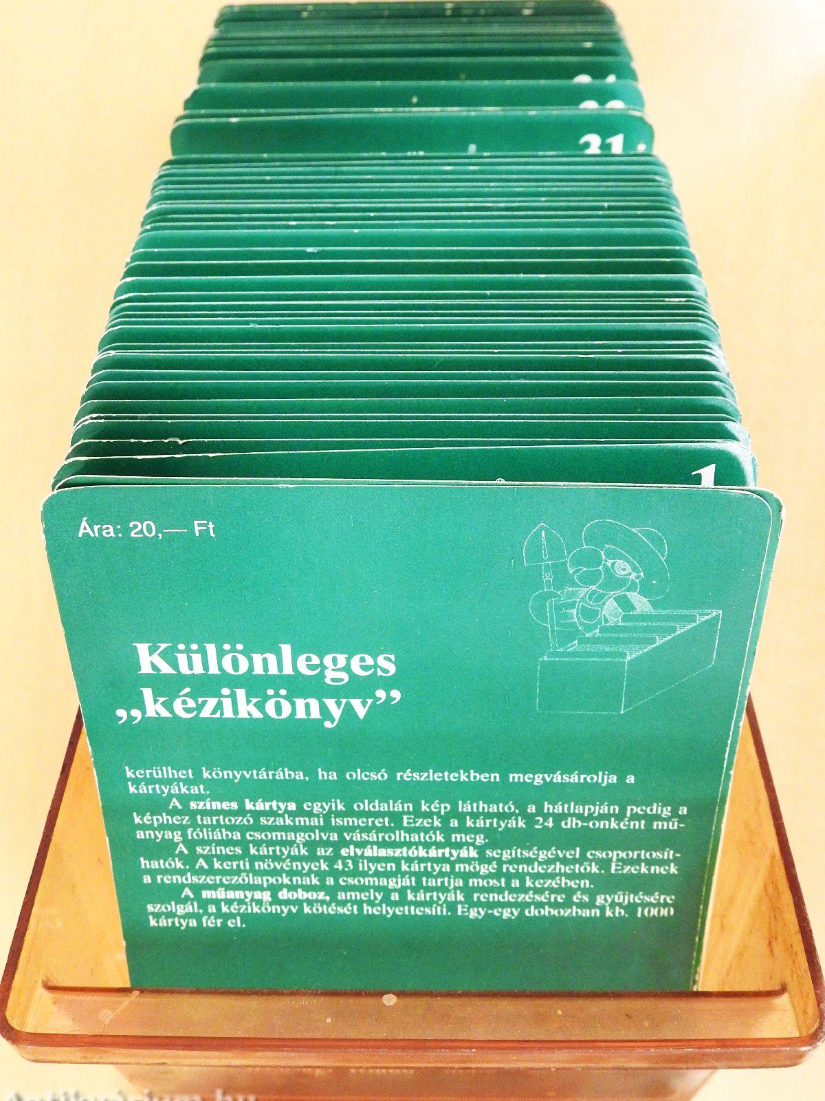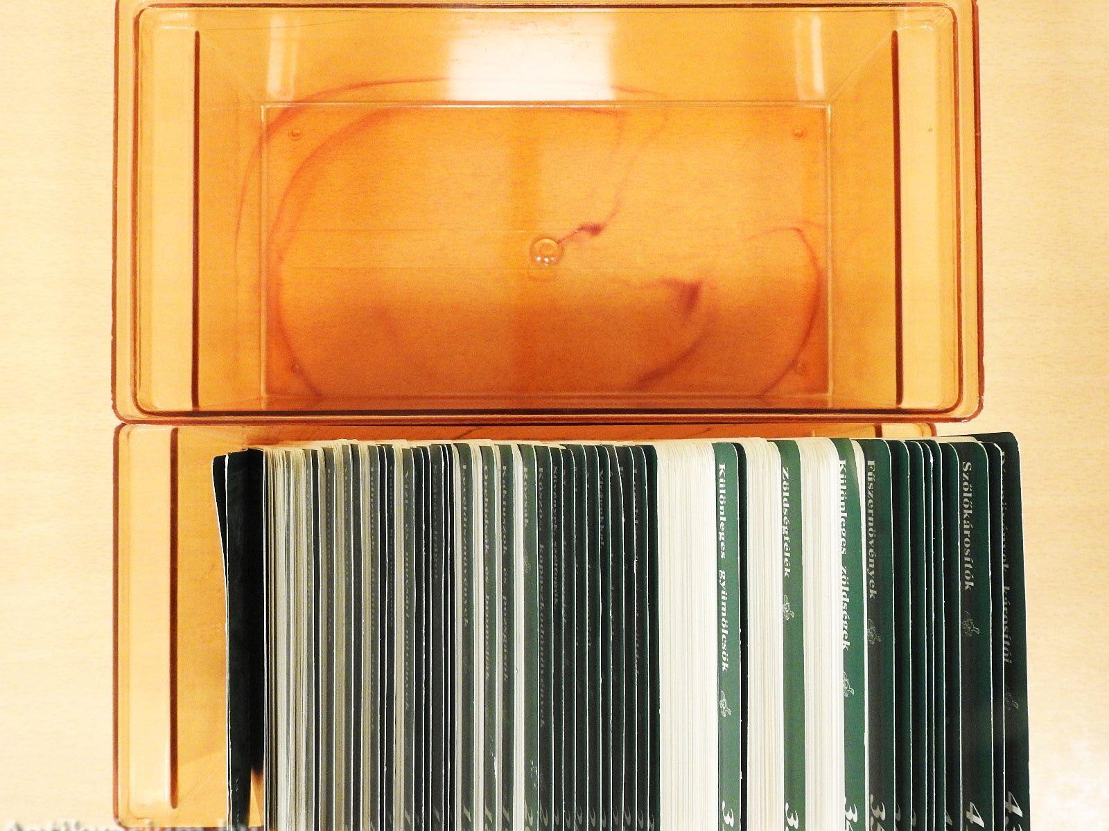 | Megjegyzés: | Teljes sorozat. 1152 db kétoldalas, színes fotókkal illusztrált kártya 43 témakörben. Műanyag tárolódobozban, elválasztókártyákkal. |