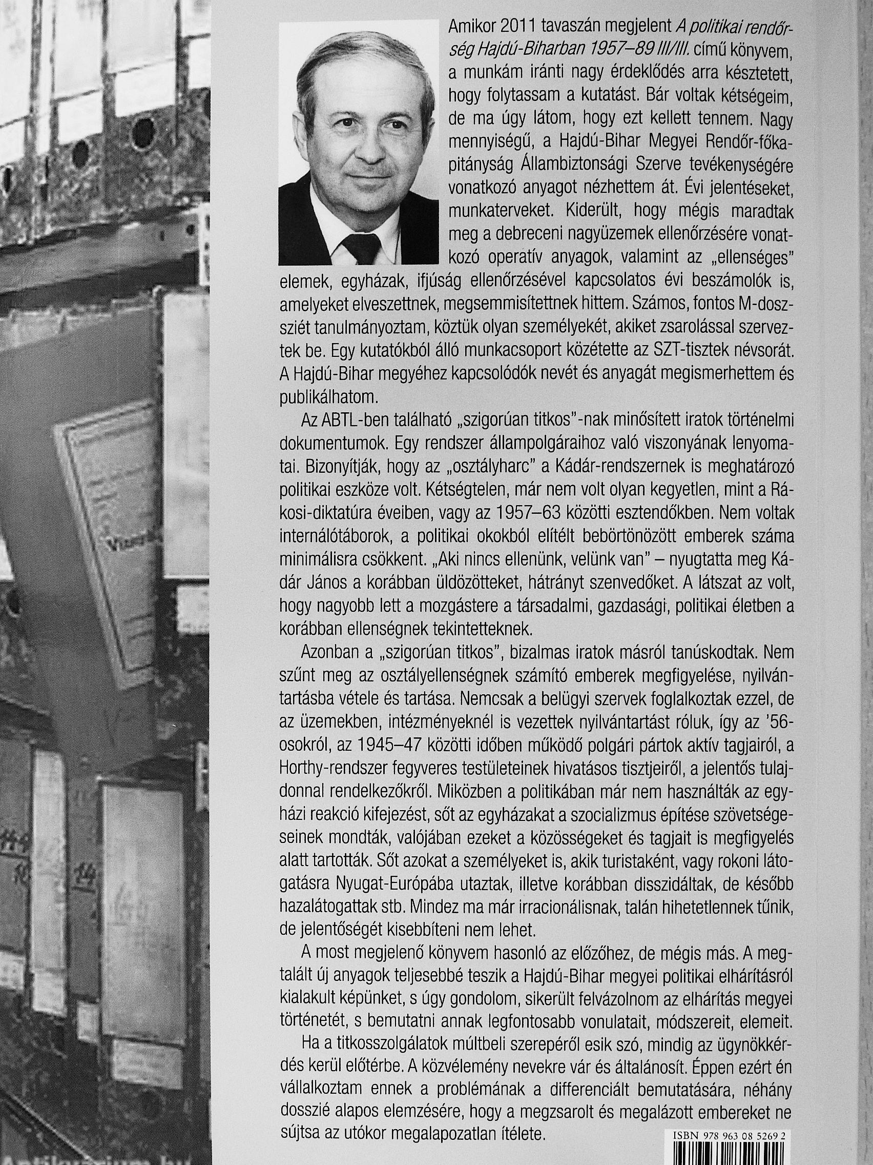 A most megjelenő könyvem hasonló az előzőhez, de mégis más. A megtalált új anyagok teljesebbé teszik a Hajdú-Bihar megyei politikai elhárításról kialakult képünket, s úgy gondolom, sikerült felvázolnom az elhárítás megyei történetét, s bemutatni annak legfontosabb vonulatait, módszereit, elemelt.