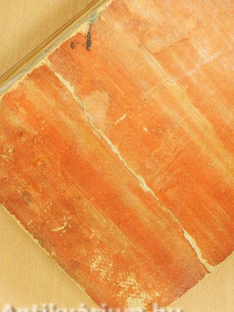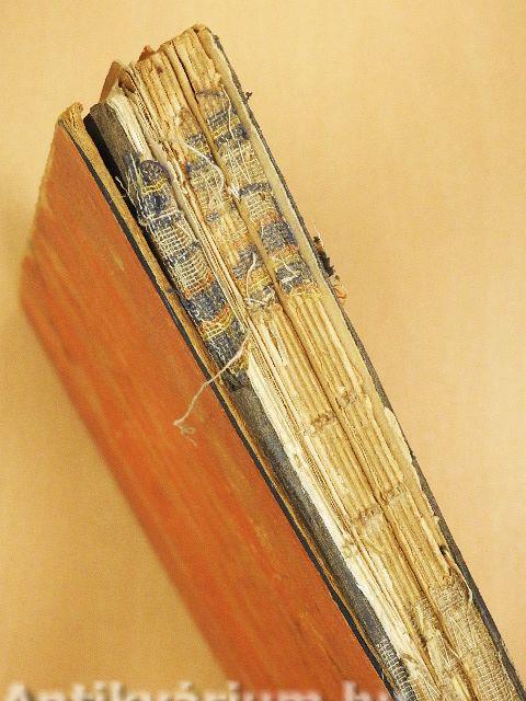 A gerinc hiányzik, a borító foltos, kopott, sérült, megtört. A kötéstáblák elváltak a könyvtesttől. Az ívek különváltak egymástól.