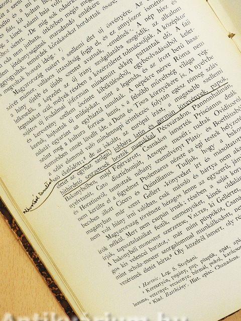 A nemzet. Költői emlékek. - A betűk ismerete és a tudomány tisztelete. Thuróczy, Werbőczy és a »Hármas-könyv«. Világiak és egyháziak. Kinizsy Pál és Magyar Benigna. Magyar Benigna imádságos könyvei. Simon úr imádságos könyve. A világiak imádságos könyvei és a költészet. Vásárhelyi András Cantilenája. Ének Szent László királyról. - A vers-formák. - Mátyás és a költészet. Pannónia megvétele. Tar Lőrinc pokoljárata. - Az első »lantos« müve. Emlékdal Mátyás halálára. - A hanyatlás. Alkalmi verselők. Az első magyar szatirikus