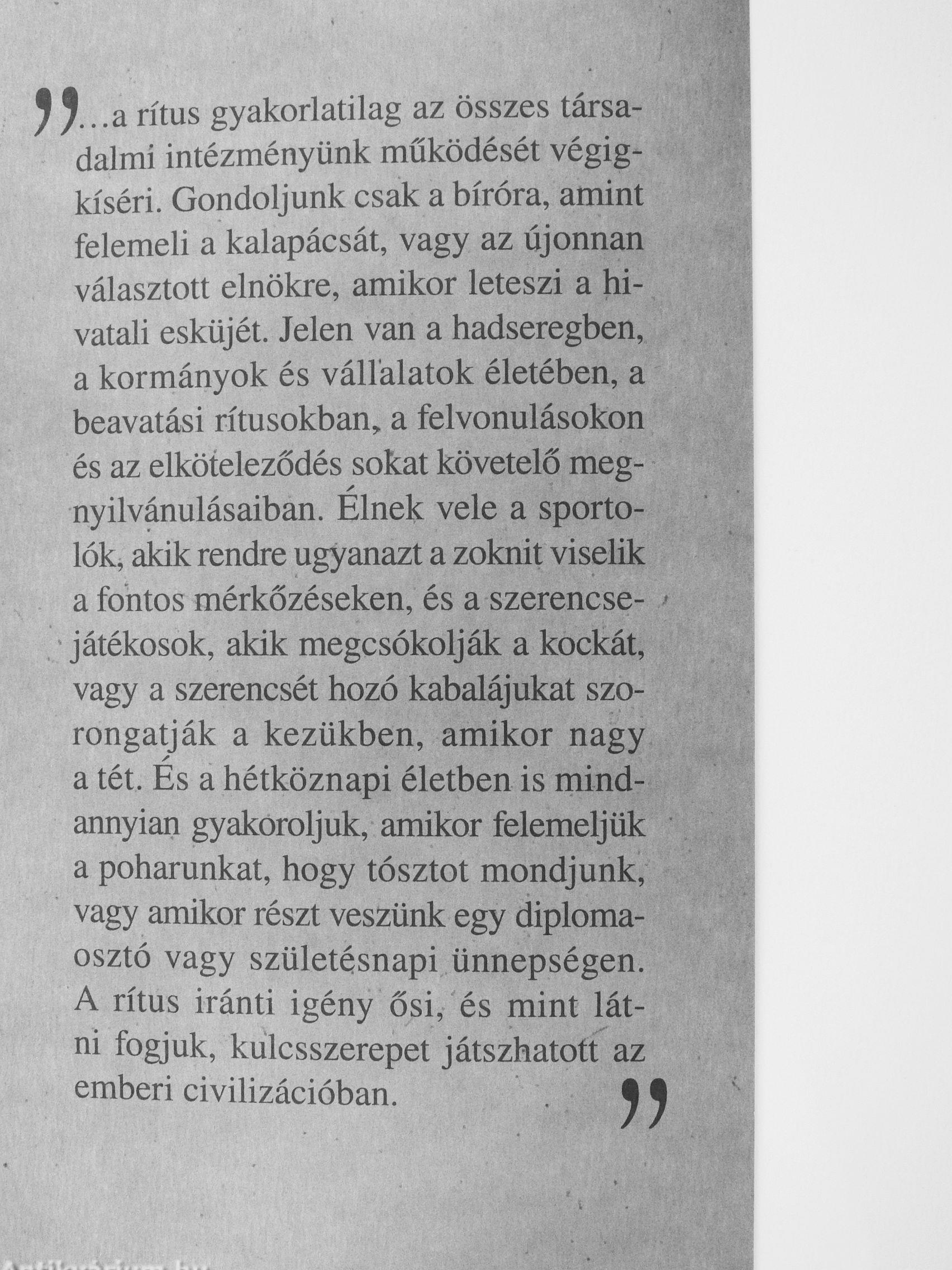 J J .a rítus gyakorlatilag az összes társadalmi intézményünk míiködését végigkíséri. Gondoljunk csak a bíróra, amint felemeli a kalapácsát, vagy az íjjonnan választott elnökre, amikor leteszi a hivatali esküjét. Jelen van a hadseregben, a kormányok és vállalatok életében, a beavatási rítusokban, a felvonulásokon és az elköteleződés sokat követelő megnyilvánulásaiban. Élnek vele a sportolók, akik rendre ugyanazt a zoknit viselik a fontos mérkőzéseken, és a szerencse- • játékosok, akik megcsókolják a kockát, vagy a szerencsét hozó kabalájukat szorongatják a kezükben, amikor nagy a tét. És a hétköznapi életben is mindannyian gyakoroljuk, amikor felemeljük a poharunkat, hogy tósztot mondjunk, vagy amikor részt veszünk egy diplomaosztó vagy születésnapi ünnepségen. A rítus iránti igény ősi, és mint látni fogjuk, kulcsszerepet játszhatott az emberi civilizációban. JJ