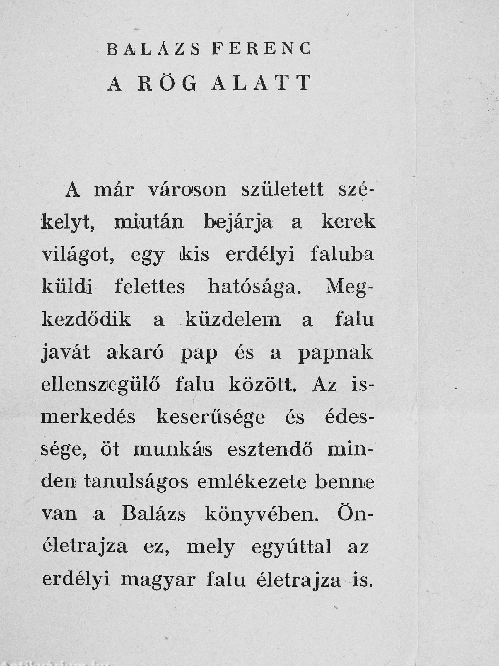 A már városon született székelyt, miután bejárja a kerek világot, egy kis erdélyi faluba küldi felettes hatósága. Megkezdődik a küzdelem a falu javát akaró pap és a papnak ellenszegülő falu között. Az ismerkedés keserűsége és édessége, öt munkás esztendő minden tanulságos emlékezete benne van a Balázs könyvében. Önéletrajza ez, mely egyúttal az erdélyi magyar falu életrajza is.