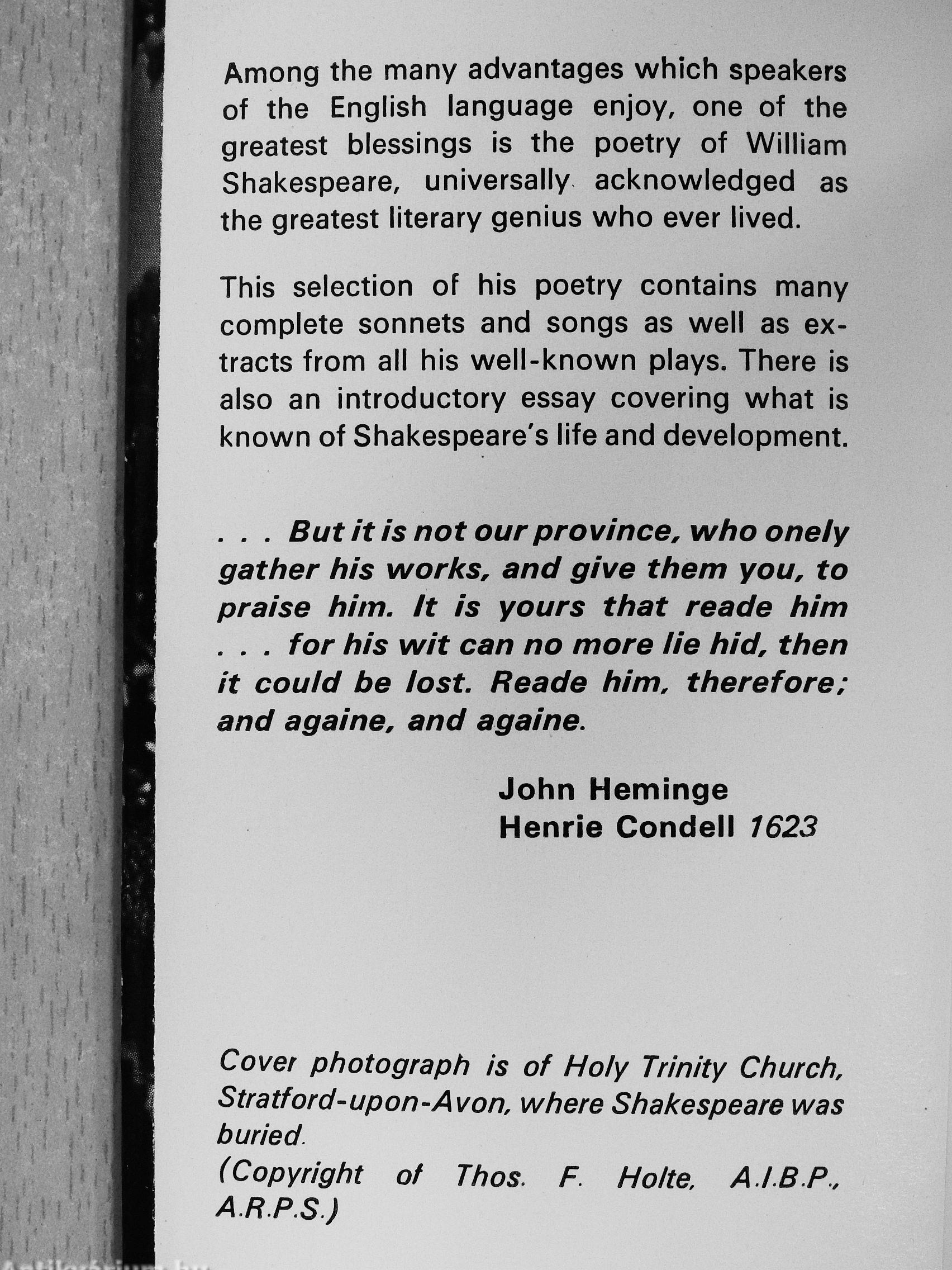 Among the many advantages which speakers of the English language enjoy, one of the greatest blessings is the poetry of William Shakespeare, universally acknowledged as the greatest literary genius who ever lived.