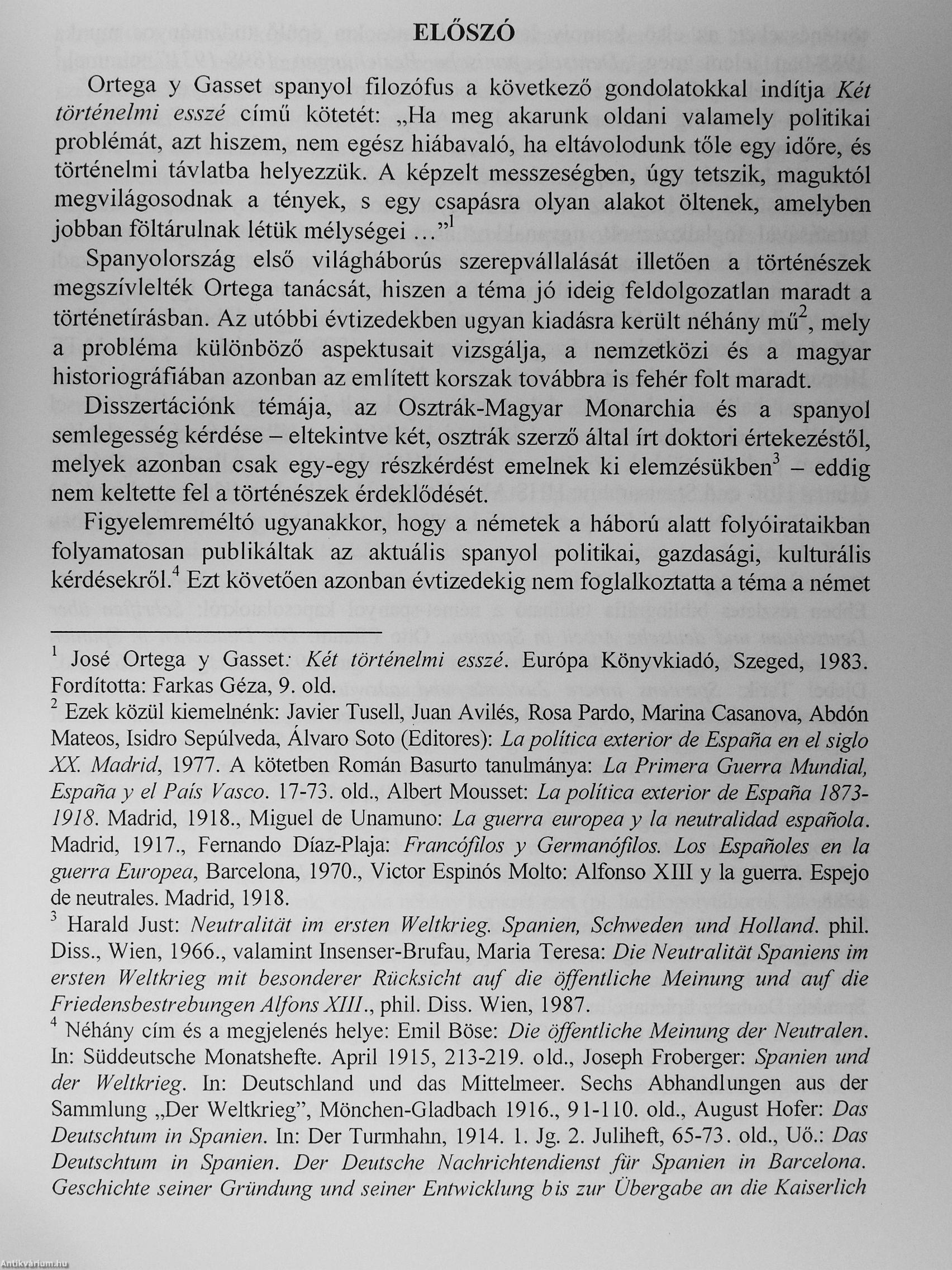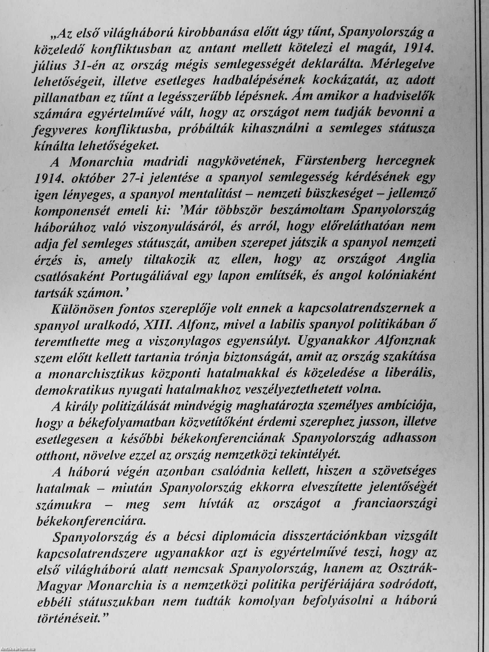 Spanyolország és a bécsi diplomácia disszertációnkban vizsgált kapcsolatrendszere ugyanakkor azt is egyértelművé teszi, hogy az első világháború alatt nemcsak Spanyolország, hanem az Osztrák-Magyar Monarchia is a nemzetközi politika perifériájára sodródott, ebbéli státuszukban nem tudták komolyan befolyásolni a háború történéseit."