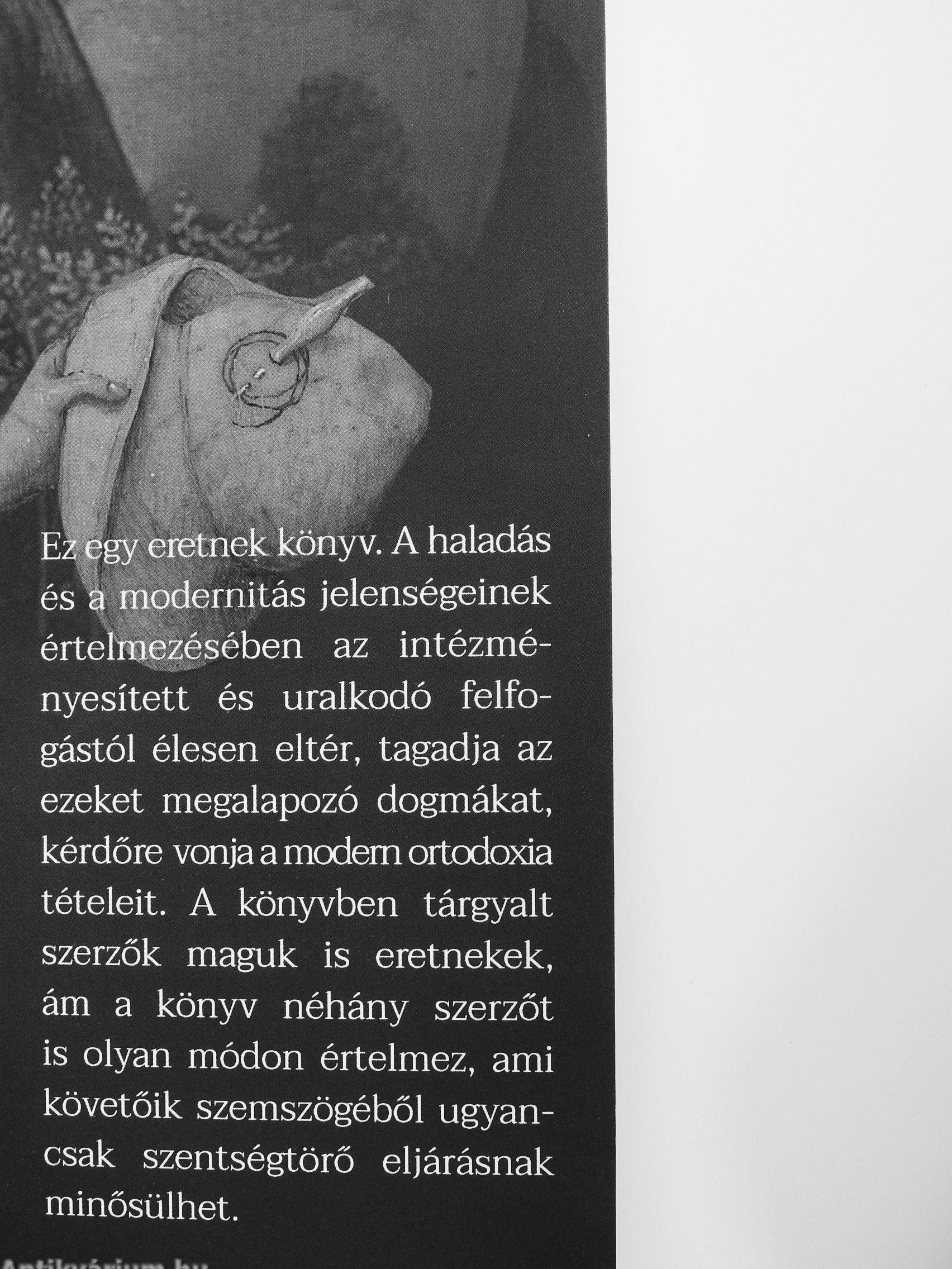 EMgy e^nek könyv. A haladás ésriloclernitás jelenségeinek értell^i^sében az intezme-nyesített és uralkodó felfogástói élesen eltér, tagadja az ezeket megalapozó dogmákat, kérdőre vonja a modem ortodoxia tételeit. A könyvben tárgyalt szerzők maguk is eretnekek, ám a könyv néhány szerzőt is olyan módon értelmez, ami követőik szemszögéből ugyancsak szentségtörő eljárásnak minősülhet.