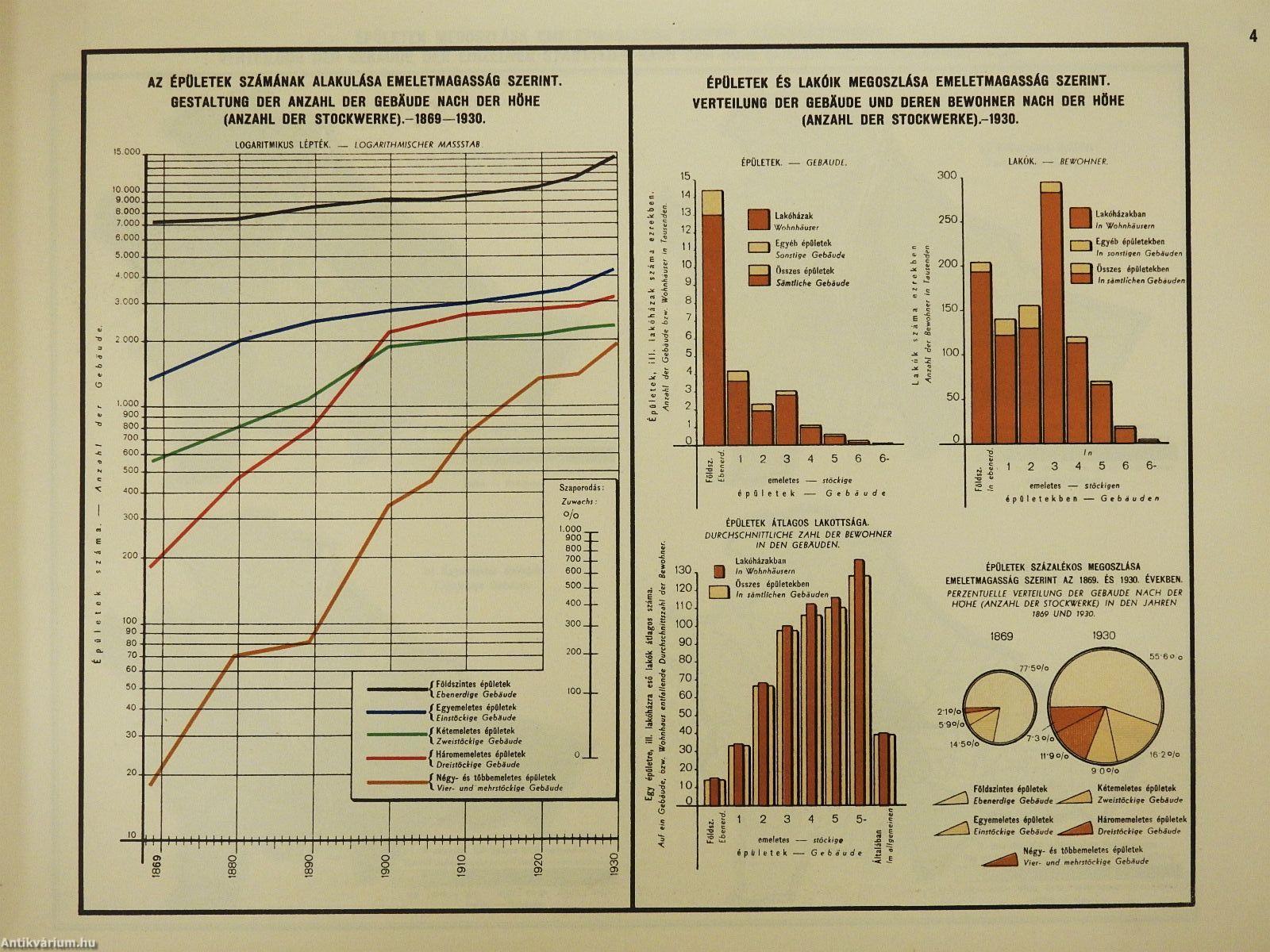 Megjegyzés: Színes térkép- és statisztikai táblákkal illusztrálva, melyből 1 kihajtható, német-magyar feliratozással. Zsinórral átfűzött kiadói egészvászon kötésben. Megjelent Budapest székesfőváros egyesítésének hatvanadik évfordulója alkalmából. Budapest székesfőváros házinyomdája nyomása.