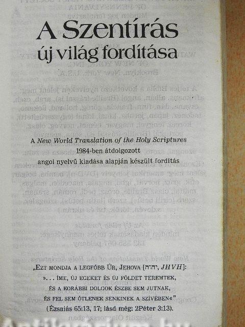 Ez az új magyar bibliafordítás, amely az angol New World Translation of the Holy Scriptures 1984-es kiadásán alapszik, a Héber-Arámi Iratok 39 könyvet, valamint a 2000-ben kiadott magyar nyelvű Keresztény Görög Iratok 27 átdolgozott könyvét tartalmazza. Az Új Világ Bibliafordító Bizottság úgy döntött, hogy a Szentírásnak ezt a két részét a megírásuk eredeti nyelvei alapján nevezi el, és nem a közismert, "Ószövetség" és "Újszövetség" elnevezéseket használja. A bizottság azért döntött így, mert a Biblia valójában egyetlen mű, és egyik része sem elavult vagy "ő". Az üzenete a Héber Iratok első könyvétől kezdve a Görög Iratok utolsó könyvéig összefüggő. Az olvasót több mint 125 000 keresztutalás és egy bibliai kifejezésekből összeállított szójegyzék segíti a Biblia egészének a tanulmányozásában.
