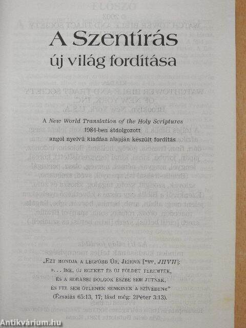 Ez az új magyar bibliafordítás, amely az angol New World Translation of the Holy Scriptures 1984-es kiadásán alapszik, a Héber-Arámi Iratok 39 könyvet, valamint a 2000-ben kiadott magyar nyelvű Keresztény Görög Iratok 27 átdolgozott könyvét tartalmazza. Az Új Világ Bibliafordító Bizottság úgy döntött, hogy a Szentírásnak ezt a két részét a megírásuk eredeti nyelvei alapján nevezi el, és nem a közismert, "Ószövetség" és "Újszövetség" elnevezéseket használja. A bizottság azért döntött így, mert a Biblia valójában egyetlen mű, és egyik része sem elavult vagy "ő". Az üzenete a Héber Iratok első könyvétől kezdve a Görög Iratok utolsó könyvéig összefüggő. Az olvasót több mint 125 000 keresztutalás és egy bibliai kifejezésekből összeállított szójegyzék segíti a Biblia egészének a tanulmányozásában.