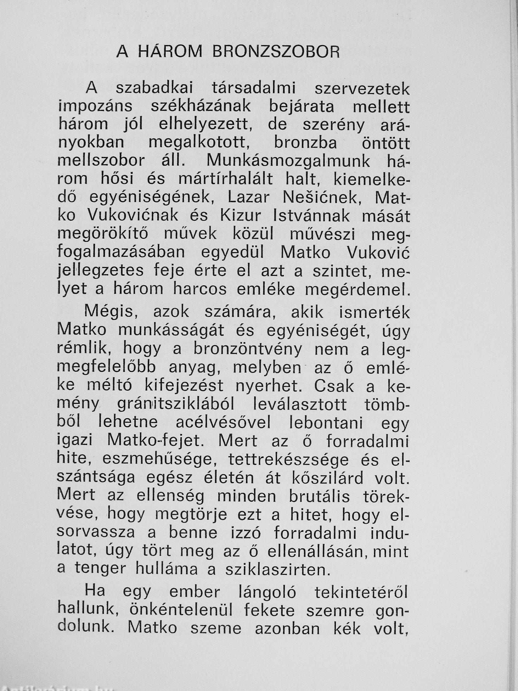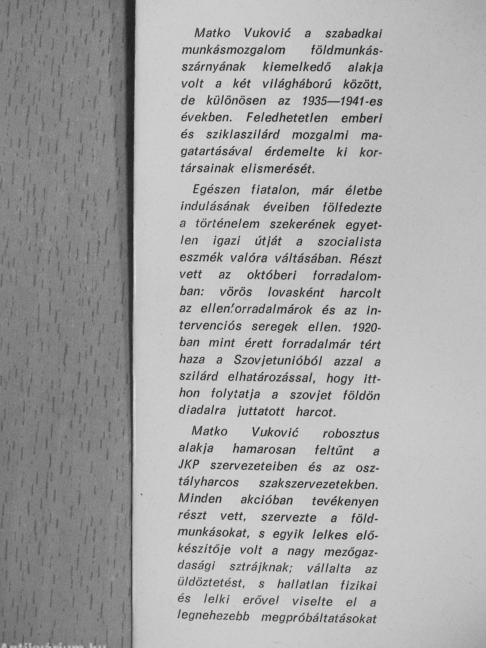 is. Többször letartóztatták, rettenetesen megkínozták, el is ítélték. Hóhérai mindent elkövettek, hogy megtörjék, de ez egyetlen esetben sem sikerült, még Horthy hírhedt kémeihárí-tóinak sem. Matko Vukovlc a szabadkai Sárga Ház kinpadán életét áldozta a fasizmus elleni harcban.