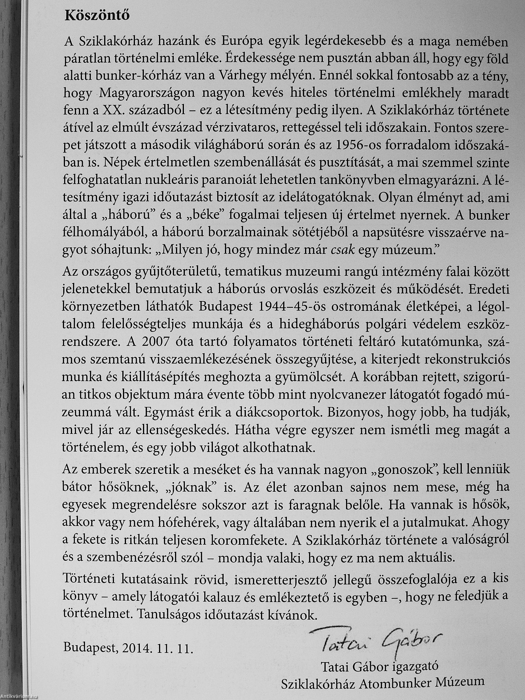 A Sziklakórház legendába hajló, 2002-ig „szigorúan titkos" történetének első, hiteles leírását tartja kezében a Kedves Olvasó! Ahogyan a szerző végigpörgeti a létesítmény születésének és működésének históriáját, érzékelni lehet azt a szeretetteljes figyelmet, ami több az egyszerű kutatói érdeklődésnél. Nem csak feltárja az eseményeket, s közreadja erről ismereteit, de be is vonja hallgatóságát abba a világba, amit leír. A művet visszaemlékező orvosok, nővérek, betegek lélekbemarkoló gondolatai, továbbá műszaki rajzok, térképek és fotók teszik még érdekfeszítőbbé. A kiskatonákat ápoló grófnők, a korábban nyilas főorvos embermentő munkája, a forradalom alatt forradalmárokat és szovjet katonákat is gyógyító, később kényszerből ügynöki jelentéseket író másik főorvos sorsa egy olyan történelmi valóságot tár az olvasó elé, mely vetekszik az írói fantáziával. A titkos hidegháborús fejlesztésekről mindent elmond, hogy az atomháborúra készülő óvóhely és kórház végleges átadására a kubai rakétaválság előtti hónapokban került sor. Magyarország egyetlen látogatható légókórháza és atombunkere az egyik legfiatalabb hazai muzeális intézmény, amely mementóként őrzi a XX. század máig ható borzalmait. Dr. Kedves Gyula igazgató, HM Hadtörténeti Múzeum, 2011.
