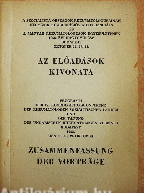 Az előadások kivonata/Budapest, október 22, 23, 24. - Programm der IV. Koordinationskonferenz der Rheumatologen Sozialitischer Lander und der Tagung des Ungarischen Rheumatologen Vereines Budapest 1968. den 22, 23, 24 Oktober - Zusammenfassung der Vorträge