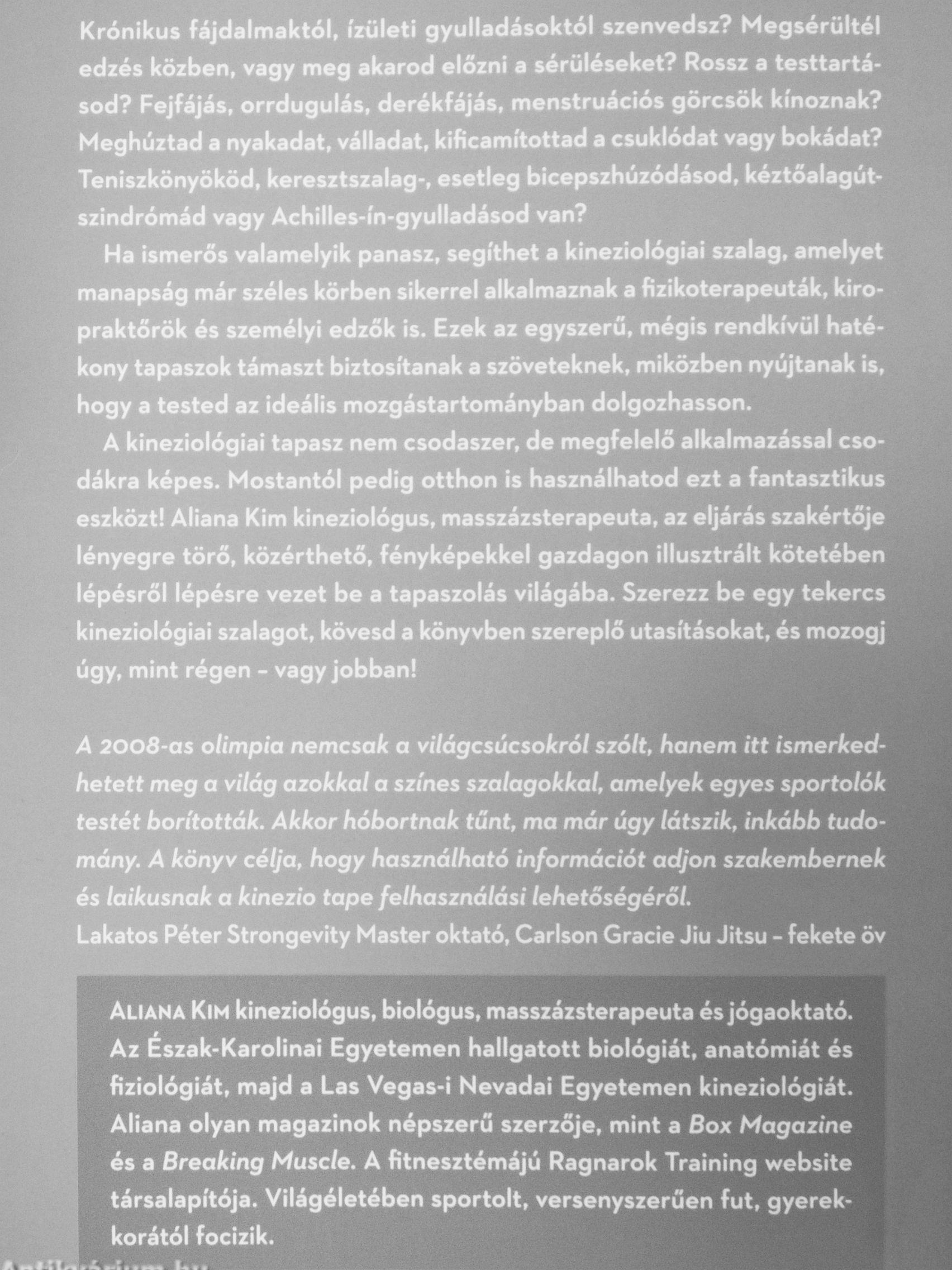 A 2008-as olimpia nemcsak a világcsúcsokról szólt, hanem itt ismerkedhetett meg a világ azokkal a színes szalagokkal, amelyek egyes sportolók testét borították. Akkor hóbortnak tűnt, ma már úgy látszik, inkább tudomány. A könyv célja, hogy használható információt adjon szakembernek és laikusnak a kinezio tape felhasználási lehetőségéről. Lakatos Péter Strongevity Master oktató, Carison Gracie Jlu Jitsu - fekete öv