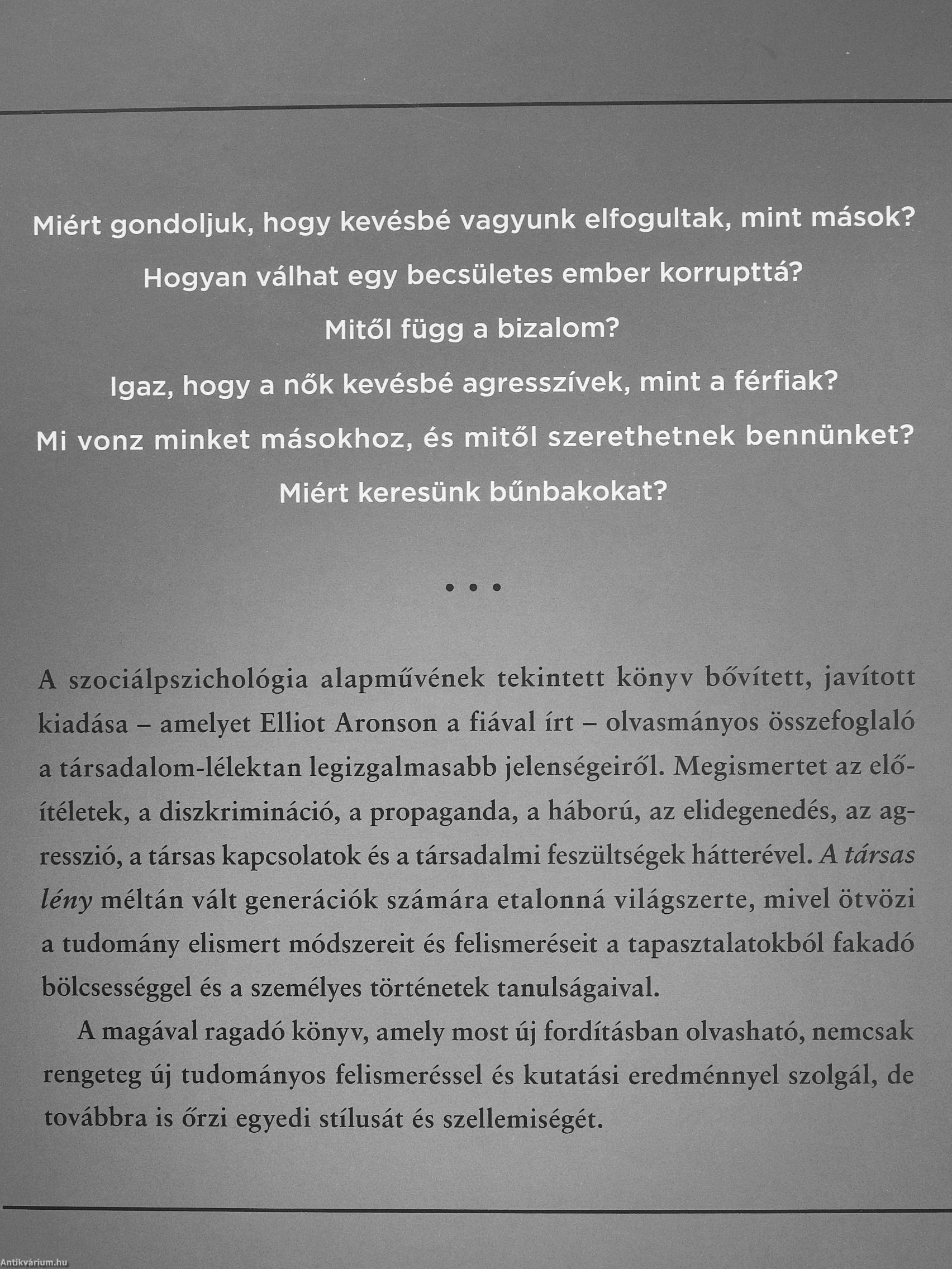 A szociálpszichológia alapművének tekintett könyv bővített, javított kiadása - amelyet Elliot Aronson a fiával írt - olvasmányos összefoglaló a társadalom-lélektan legizgalmasabb jelenségeiről. Megismertet az előítéletek, a diszkrimináció, a propaganda, a háború, az elidegenedés, az agresszió, a társas kapcsolatok és a társadalmi feszültségek hátterével. A társas lény méltán vált generációk számára etalonná világszerte, mivel ötvözi a tudomány elismert módszereit és felismeréseit a tapasztalatokból fakadó bölcsességgel és a személyes történetek tanulságaival.